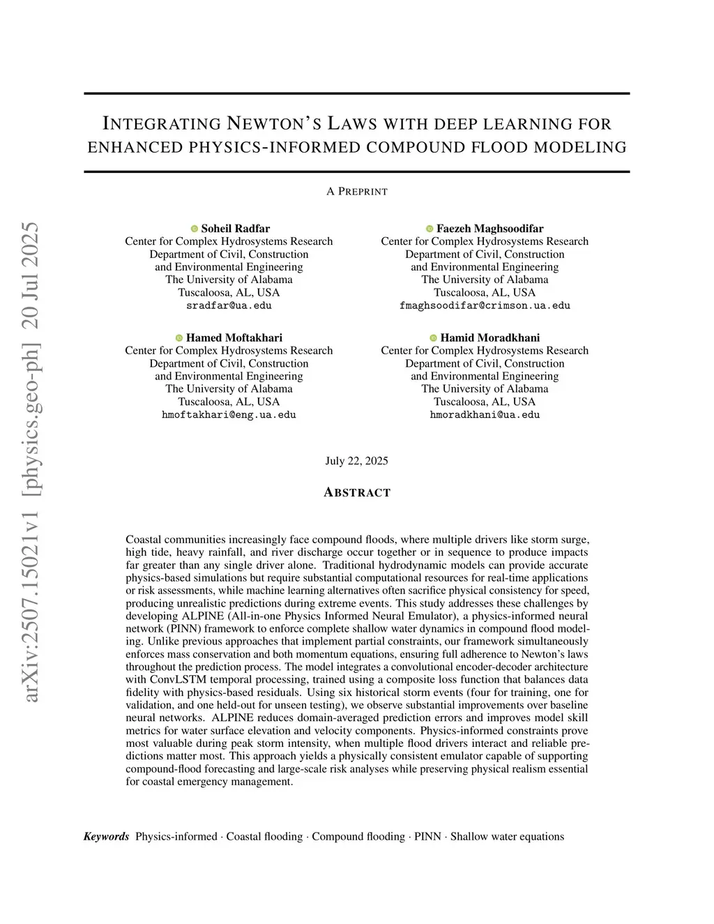 Coastal communities increasingly face compound floods, where multiple drivers like storm surge, high tide, heavy rainfall, and river discharge occur together or in sequence to produce impacts far greater than any single driver alone. Traditional hydrodynamic models can provide accurate physics-based simulations but require substantial computational resources for real-time applications or risk assessments, while machine learning alternatives often sacrifice physical consistency for speed, producing unrealistic predictions during extreme events. This study addresses these challenges by developing ALPINE (All-in-one Physics Informed Neural Emulator), a physics-informed neural network (PINN) framework to enforce complete shallow water dynamics in compound flood modeling. Unlike previous approaches that implement partial constraints, our framework simultaneously enforces mass conservation and both momentum equations, ensuring full adherence to Newton's laws throughout the prediction process. The model integrates a convolutional encoder-decoder architecture with ConvLSTM temporal processing, trained using a composite loss function that balances data fidelity with physics-based residuals. Using six historical storm events (four for training, one for validation, and one held-out for unseen testing), we observe substantial improvements over baseline neural networks. ALPINE reduces domain-averaged prediction errors and improves model skill metrics for water surface elevation and velocity components. Physics-informed constraints prove most valuable during peak storm intensity, when multiple flood drivers interact and reliable predictions matter most. This approach yields a physically consistent emulator capable of supporting compound-flood forecasting and large-scale risk analyses while preserving physical realism essential for coastal emergency management.