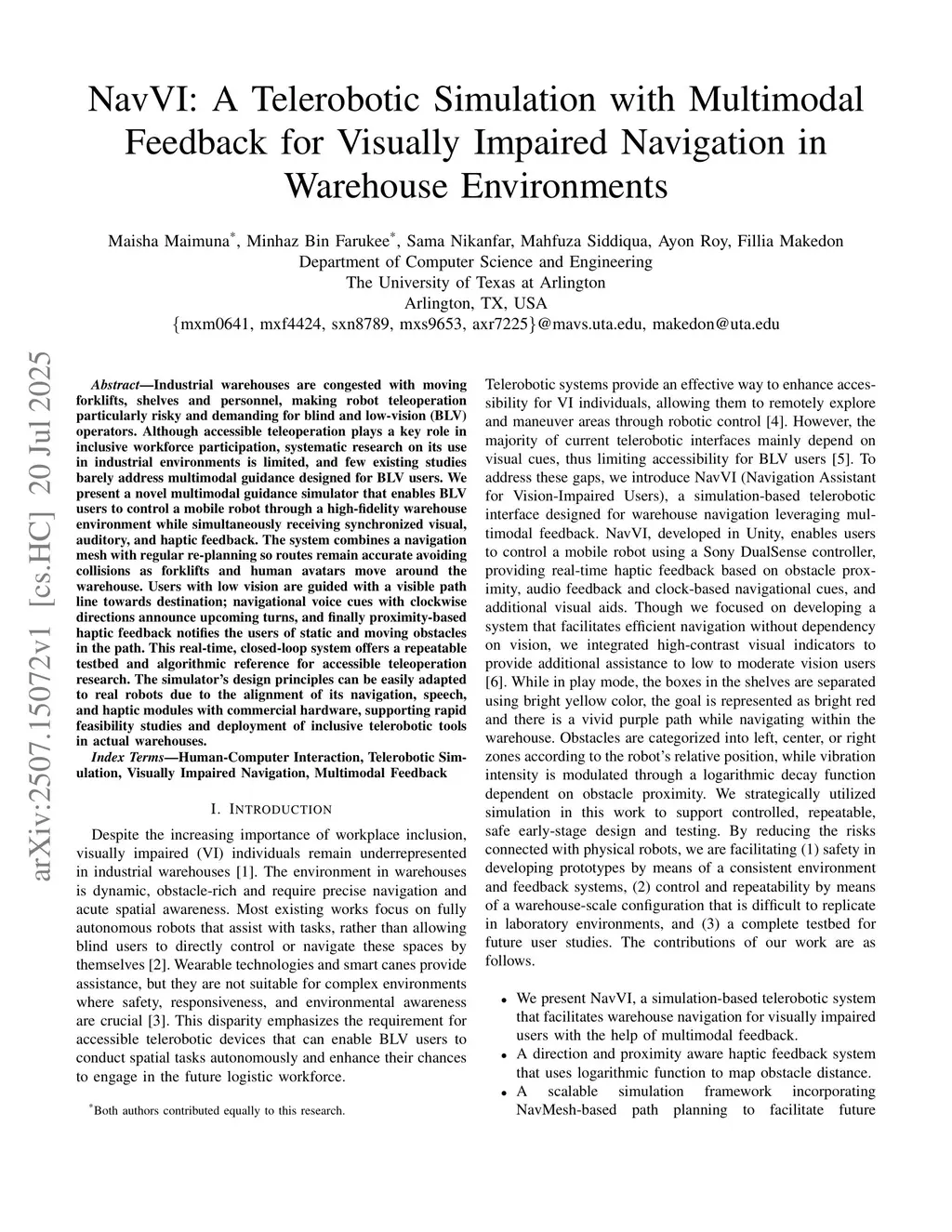 NavVI: A Telerobotic Simulation with Multimodal Feedback for Visually Impaired Navigation in Warehouse Environments