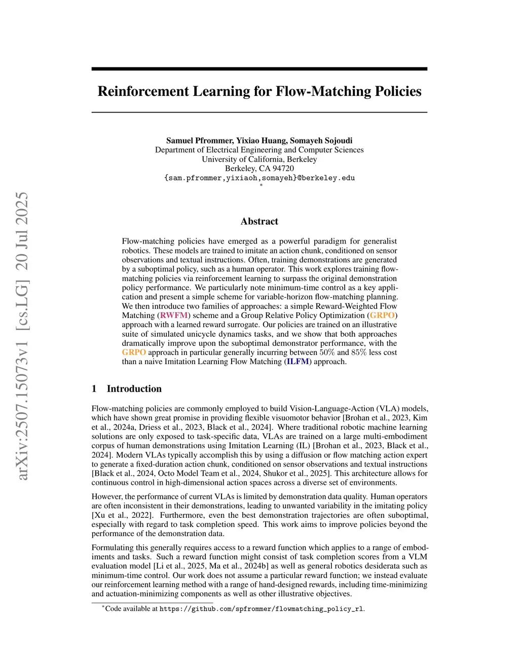 Flow-matching policies have emerged as a powerful paradigm for generalist robotics. These models are trained to imitate an action chunk, conditioned on sensor observations and textual instructions. Often, training demonstrations are generated by a suboptimal policy, such as a human operator. This work explores training flow-matching policies via reinforcement learning to surpass the original demonstration policy performance. We particularly note minimum-time control as a key application and present a simple scheme for variable-horizon flow-matching planning. We then introduce two families of approaches: a simple Reward-Weighted Flow Matching (RWFM) scheme and a Group Relative Policy Optimization (GRPO) approach with a learned reward surrogate. Our policies are trained on an illustrative suite of simulated unicycle dynamics tasks, and we show that both approaches dramatically improve upon the suboptimal demonstrator performance, with the GRPO approach in particular generally incurring between and less cost than a naive Imitation Learning Flow Matching (ILFM) approach.