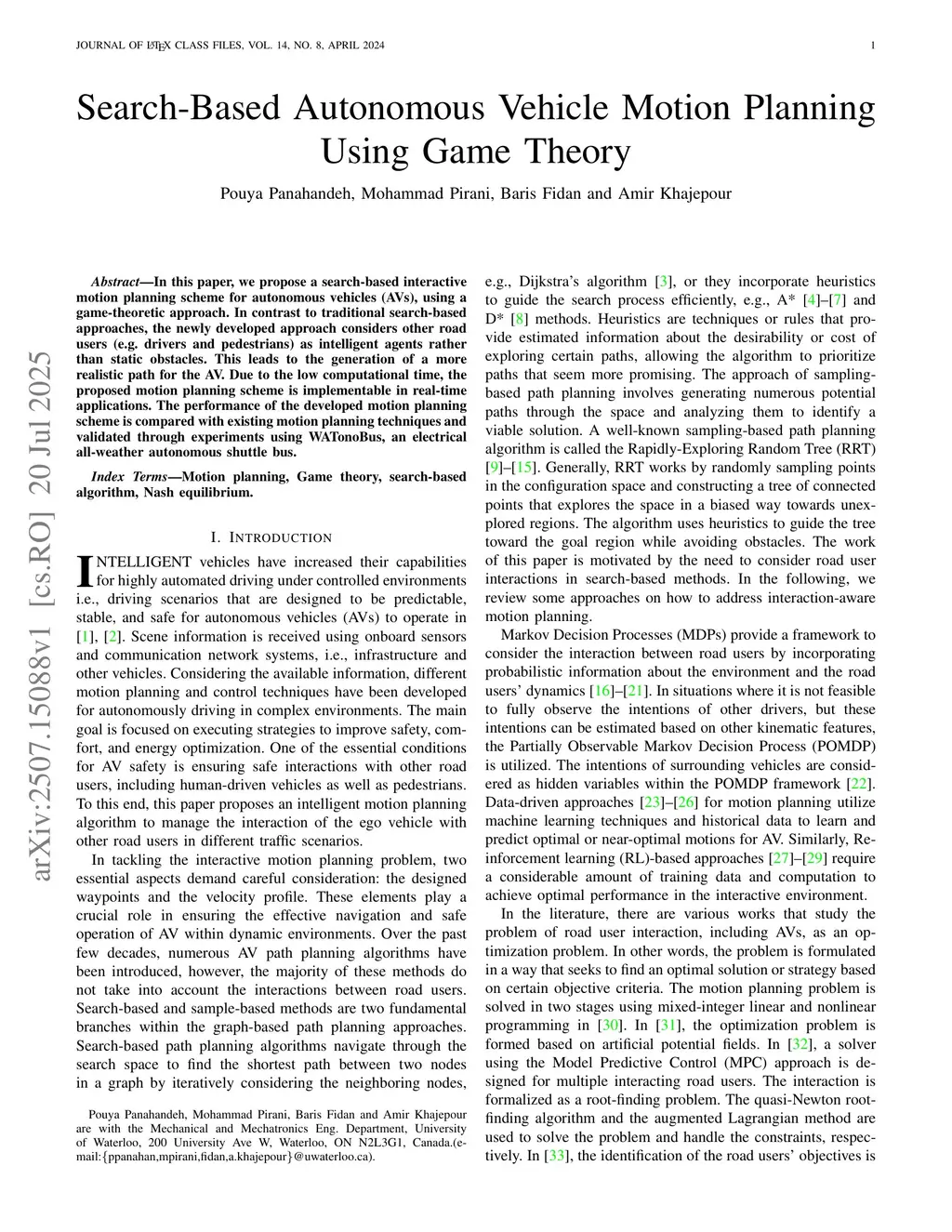 In this paper, we propose a search-based interactive motion planning scheme for autonomous vehicles (AVs), using a game-theoretic approach. In contrast to traditional search-based approaches, the newly developed approach considers other road users (e.g. drivers and pedestrians) as intelligent agents rather than static obstacles. This leads to the generation of a more realistic path for the AV. Due to the low computational time, the proposed motion planning scheme is implementable in real-time applications. The performance of the developed motion planning scheme is compared with existing motion planning techniques and validated through experiments using WATonoBus, an electrical all-weather autonomous shuttle bus.