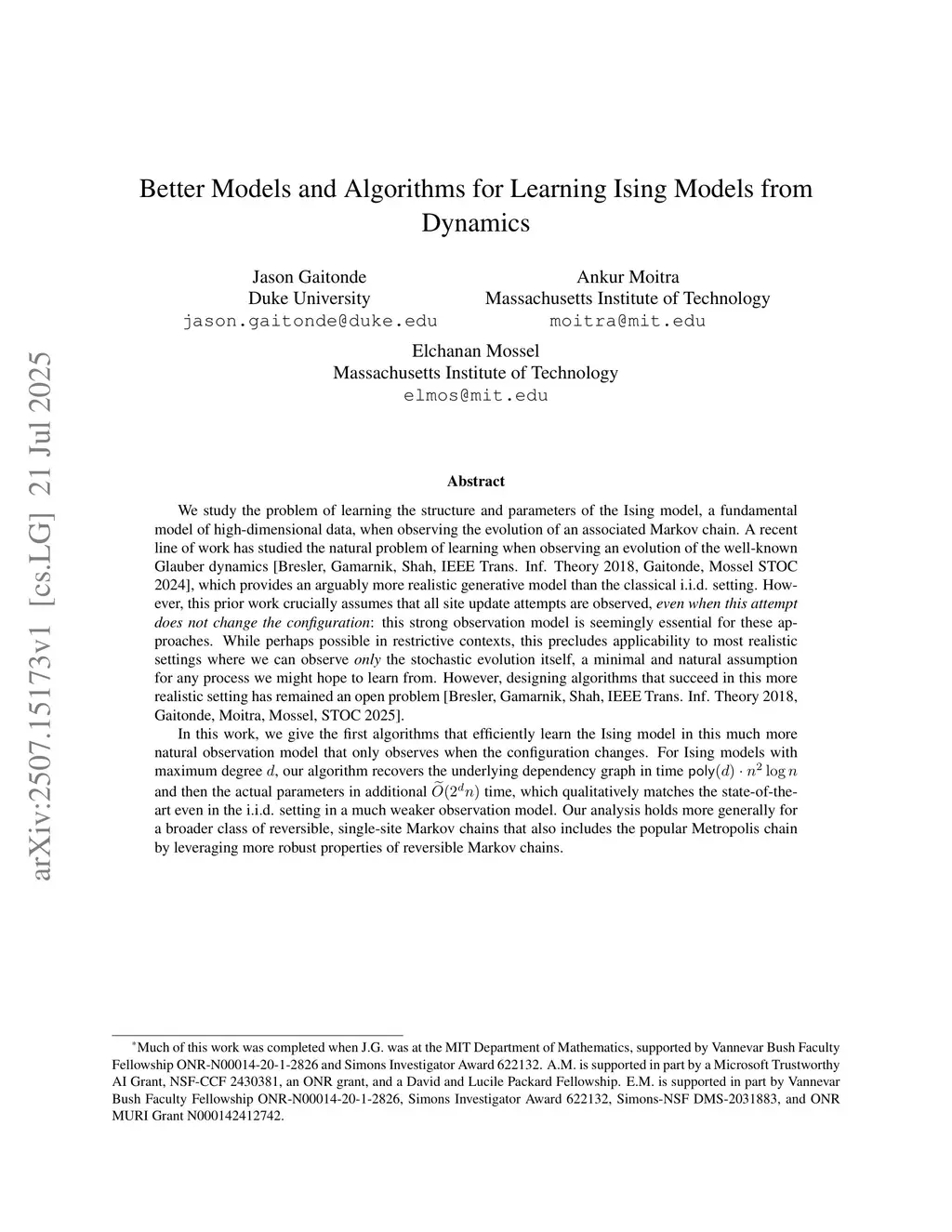 We study the problem of learning the structure and parameters of the Ising model, a fundamental model of high-dimensional data, when observing the evolution of an associated Markov chain. A recent line of work has studied the natural problem of learning when observing an evolution of the well-known Glauber dynamics [Bresler, Gamarnik, Shah, IEEE Trans. Inf. Theory 2018, Gaitonde, Mossel STOC 2024], which provides an arguably more realistic generative model than the classical i.i.d. setting. However, this prior work crucially assumes that all site update attempts are observed, \emph{even when this attempt does not change the configuration}: this strong observation model is seemingly essential for these approaches. While perhaps possible in restrictive contexts, this precludes applicability to most realistic settings where we can observe \emph{only} the stochastic evolution itself, a minimal and natural assumption for any process we might hope to learn from. However, designing algorithms that succeed in this more realistic setting has remained an open problem [Bresler, Gamarnik, Shah, IEEE Trans. Inf. Theory 2018, Gaitonde, Moitra, Mossel, STOC 2025].In this work, we give the first algorithms that efficiently learn the Ising model in this much more natural observation model that only observes when the configuration changes. For Ising models with maximum degree , our algorithm recovers the underlying dependency graph in time and then the actual parameters in additional time, which qualitatively matches the state-of-the-art even in the i.i.d. setting in a much weaker observation model. Our analysis holds more generally for a broader class of reversible, single-site Markov chains that also includes the popular Metropolis chain by leveraging more robust properties of reversible Markov chains.