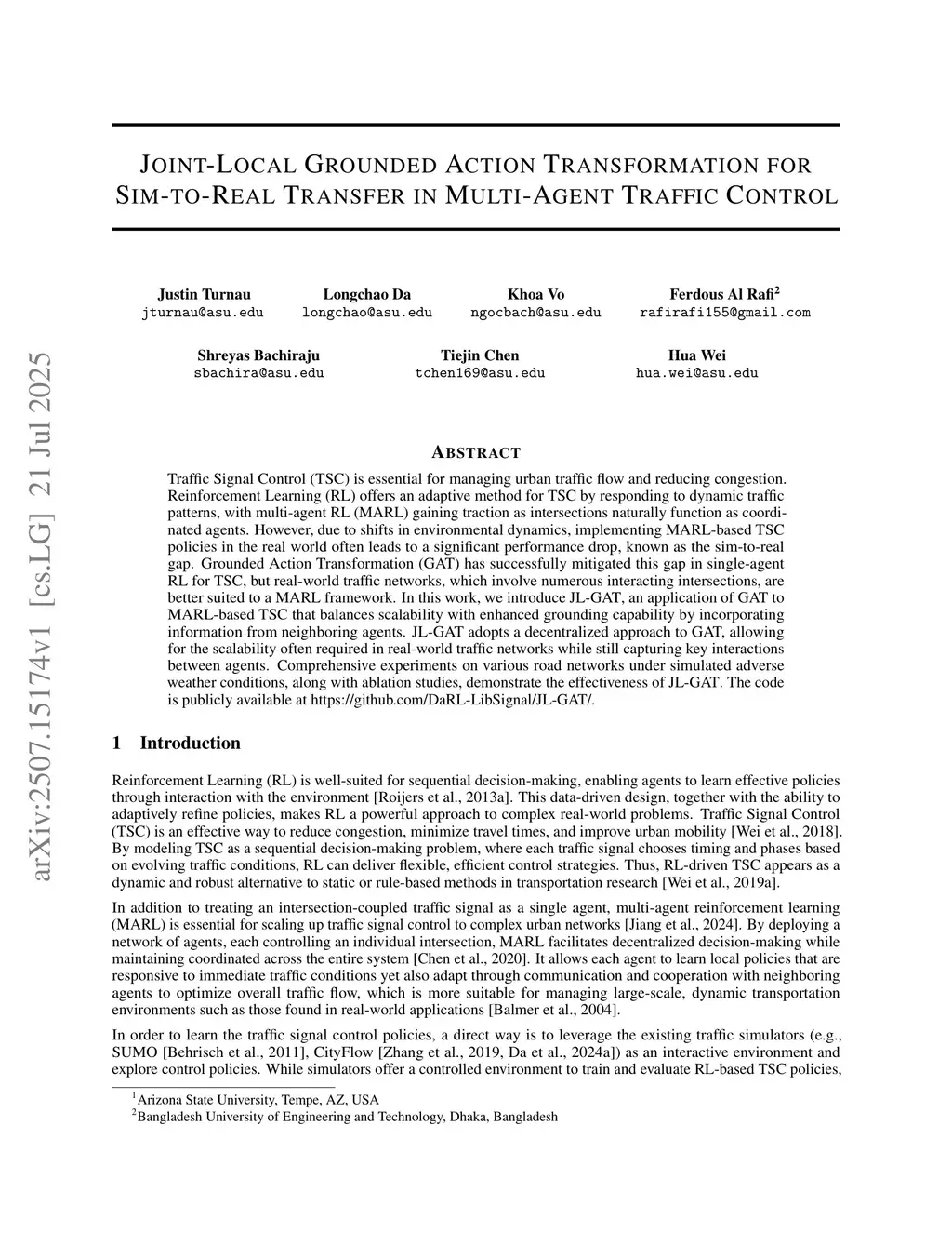 Traffic Signal Control (TSC) is essential for managing urban traffic flow and reducing congestion. Reinforcement Learning (RL) offers an adaptive method for TSC by responding to dynamic traffic patterns, with multi-agent RL (MARL) gaining traction as intersections naturally function as coordinated agents. However, due to shifts in environmental dynamics, implementing MARL-based TSC policies in the real world often leads to a significant performance drop, known as the sim-to-real gap. Grounded Action Transformation (GAT) has successfully mitigated this gap in single-agent RL for TSC, but real-world traffic networks, which involve numerous interacting intersections, are better suited to a MARL framework. In this work, we introduce JL-GAT, an application of GAT to MARL-based TSC that balances scalability with enhanced grounding capability by incorporating information from neighboring agents. JL-GAT adopts a decentralized approach to GAT, allowing for the scalability often required in real-world traffic networks while still capturing key interactions between agents. Comprehensive experiments on various road networks under simulated adverse weather conditions, along with ablation studies, demonstrate the effectiveness of JL-GAT. The code is publicly available atthis https URL.