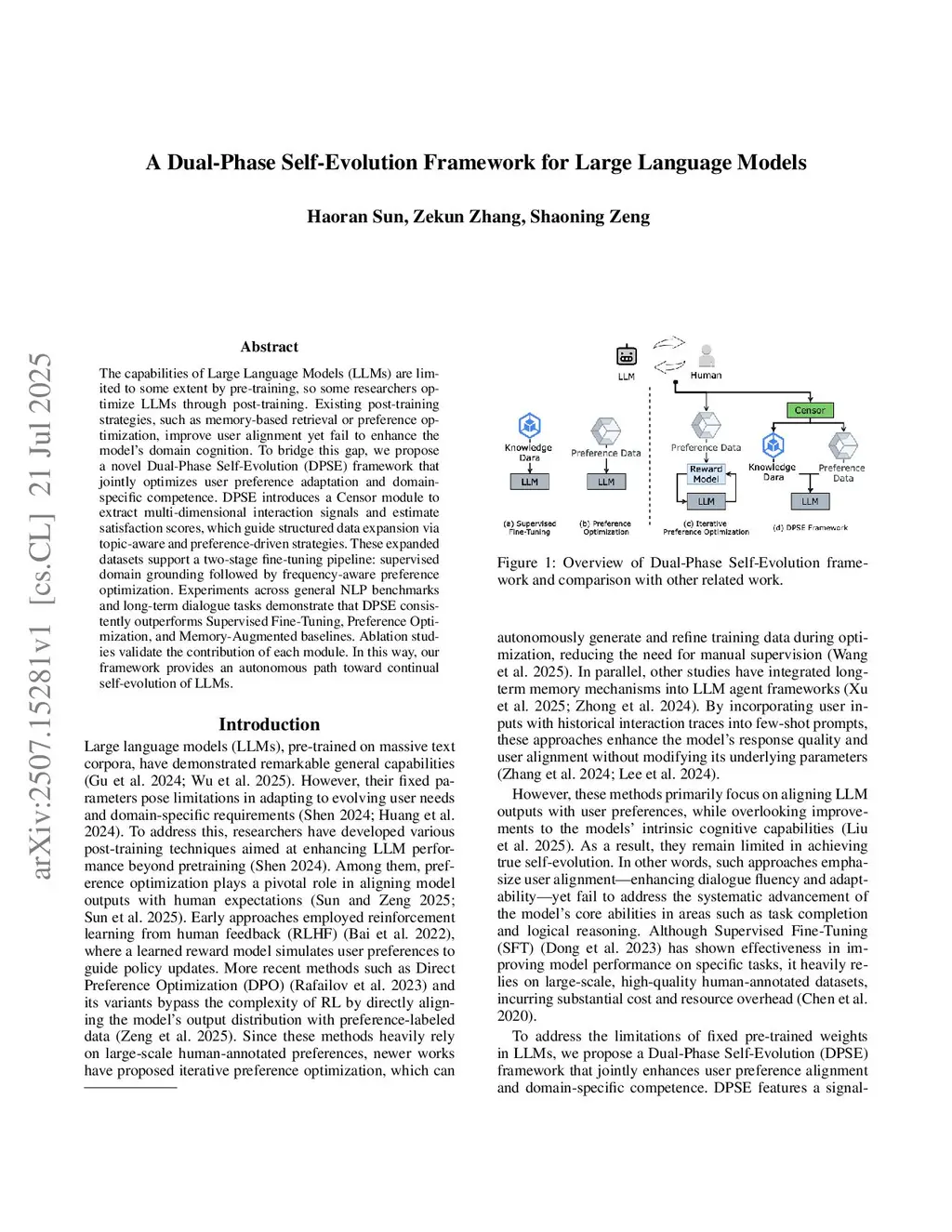The capabilities of Large Language Models (LLMs) are limited to some extent by pre-training, so some researchers optimize LLMs through post-training. Existing post-training strategies, such as memory-based retrieval or preference optimization, improve user alignment yet fail to enhance the model's domain cognition. To bridge this gap, we propose a novel Dual-Phase Self-Evolution (DPSE) framework that jointly optimizes user preference adaptation and domain-specific competence. DPSE introduces a Censor module to extract multi-dimensional interaction signals and estimate satisfaction scores, which guide structured data expansion via topic-aware and preference-driven strategies. These expanded datasets support a two-stage fine-tuning pipeline: supervised domain grounding followed by frequency-aware preference optimization. Experiments across general NLP benchmarks and long-term dialogue tasks demonstrate that DPSE consistently outperforms Supervised Fine-Tuning, Preference Optimization, and Memory-Augmented baselines. Ablation studies validate the contribution of each module. In this way, our framework provides an autonomous path toward continual self-evolution of LLMs.
