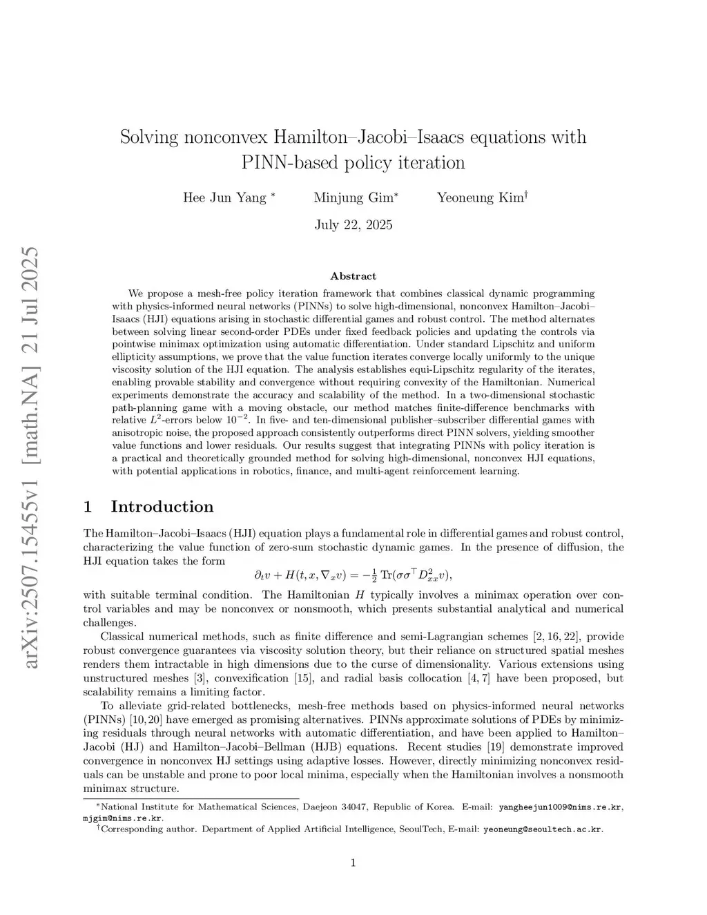 We propose a mesh-free policy iteration framework that combines classical dynamic programming with physics-informed neural networks (PINNs) to solve high-dimensional, nonconvex Hamilton--Jacobi--Isaacs (HJI) equations arising in stochastic differential games and robust control. The method alternates between solving linear second-order PDEs under fixed feedback policies and updating the controls via pointwise minimax optimization using automatic differentiation. Under standard Lipschitz and uniform ellipticity assumptions, we prove that the value function iterates converge locally uniformly to the unique viscosity solution of the HJI equation. The analysis establishes equi-Lipschitz regularity of the iterates, enabling provable stability and convergence without requiring convexity of the Hamiltonian. Numerical experiments demonstrate the accuracy and scalability of the method. In a two-dimensional stochastic path-planning game with a moving obstacle, our method matches finite-difference benchmarks with relative -errors below %10^{-2}%. In five- and ten-dimensional publisher-subscriber differential games with anisotropic noise, the proposed approach consistently outperforms direct PINN solvers, yielding smoother value functions and lower residuals. Our results suggest that integrating PINNs with policy iteration is a practical and theoretically grounded method for solving high-dimensional, nonconvex HJI equations, with potential applications in robotics, finance, and multi-agent reinforcement learning.