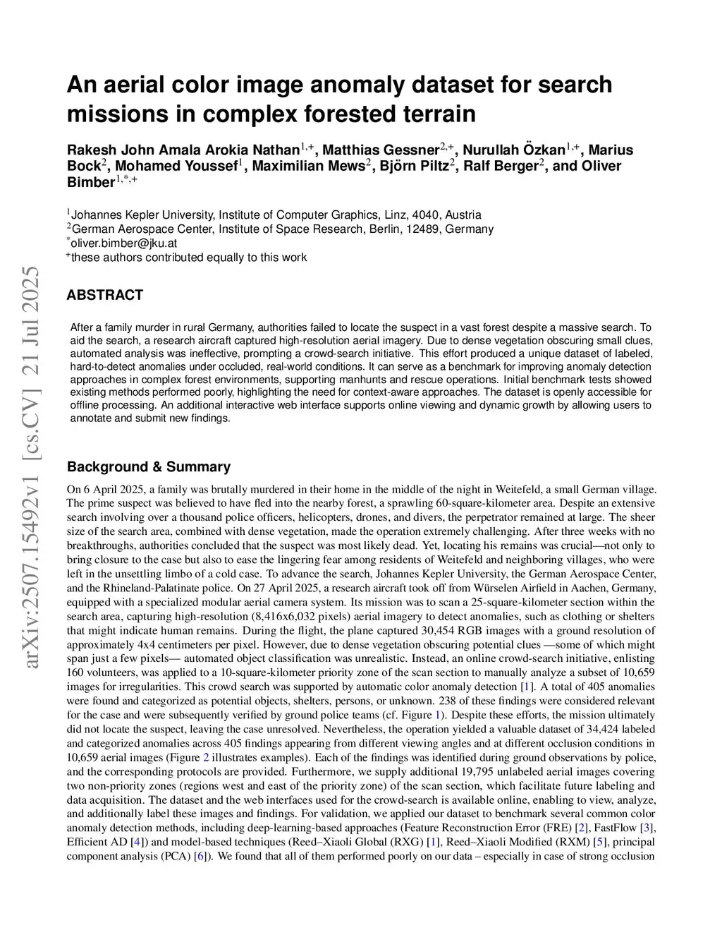 After a family murder in rural Germany, authorities failed to locate the suspect in a vast forest despite a massive search. To aid the search, a research aircraft captured high-resolution aerial imagery. Due to dense vegetation obscuring small clues, automated analysis was ineffective, prompting a crowd-search initiative. This effort produced a unique dataset of labeled, hard-to-detect anomalies under occluded, real-world conditions. It can serve as a benchmark for improving anomaly detection approaches in complex forest environments, supporting manhunts and rescue operations. Initial benchmark tests showed existing methods performed poorly, highlighting the need for context-aware approaches. The dataset is openly accessible for offline processing. An additional interactive web interface supports online viewing and dynamic growth by allowing users to annotate and submit new findings.