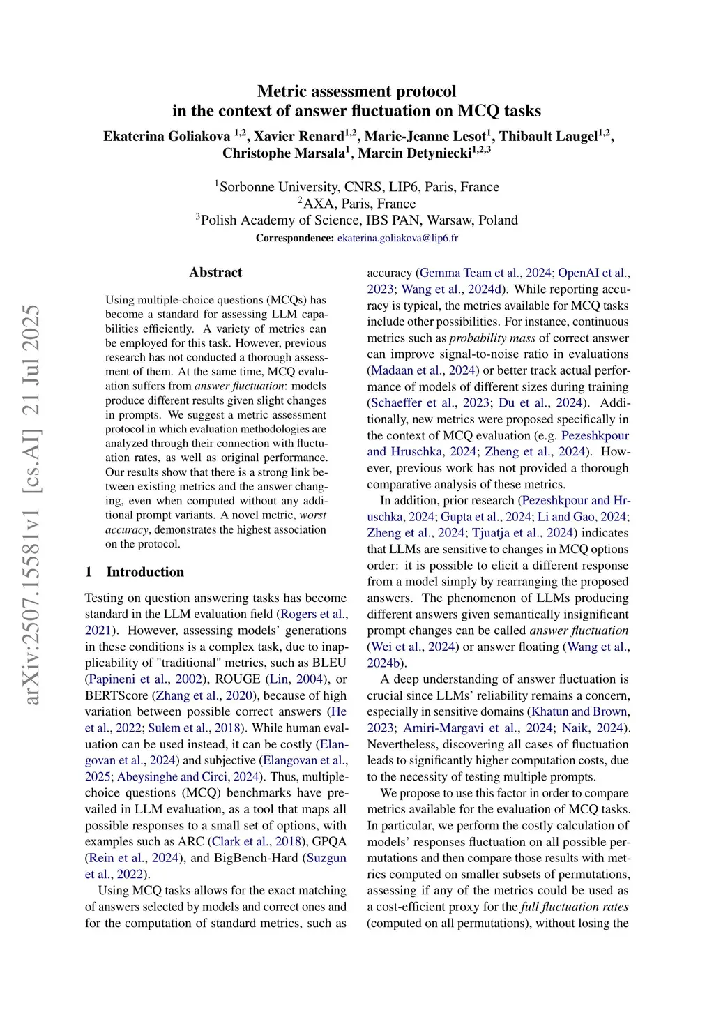 Metric assessment protocol in the context of answer fluctuation on MCQ tasks