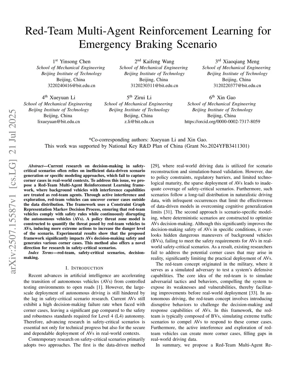 Red-Team Multi-Agent Reinforcement Learning for Emergency Braking Scenario