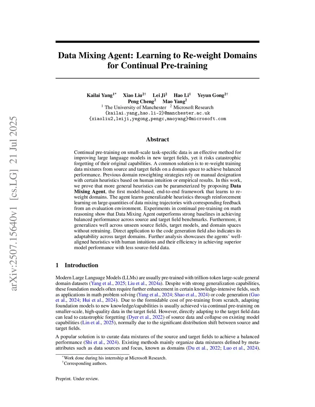 Continual pre-training on small-scale task-specific data is an effective method for improving large language models in new target fields, yet it risks catastrophic forgetting of their original capabilities. A common solution is to re-weight training data mixtures from source and target fields on a domain space to achieve balanced performance. Previous domain reweighting strategies rely on manual designation with certain heuristics based on human intuition or empirical results. In this work, we prove that more general heuristics can be parameterized by proposing Data Mixing Agent, the first model-based, end-to-end framework that learns to re-weight domains. The agent learns generalizable heuristics through reinforcement learning on large quantities of data mixing trajectories with corresponding feedback from an evaluation environment. Experiments in continual pre-training on math reasoning show that Data Mixing Agent outperforms strong baselines in achieving balanced performance across source and target field benchmarks. Furthermore, it generalizes well across unseen source fields, target models, and domain spaces without retraining. Direct application to the code generation field also indicates its adaptability across target domains. Further analysis showcases the agents' well-aligned heuristics with human intuitions and their efficiency in achieving superior model performance with less source-field data.