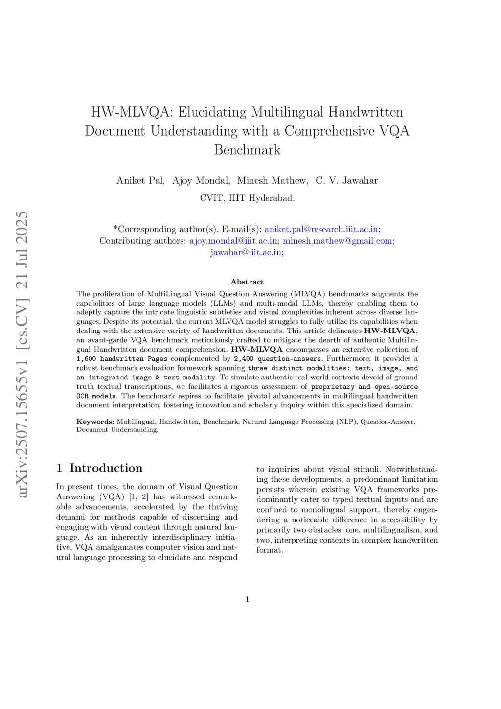 The proliferation of MultiLingual Visual Question Answering (MLVQA) benchmarks augments the capabilities of large language models (LLMs) and multi-modal LLMs, thereby enabling them to adeptly capture the intricate linguistic subtleties and visual complexities inherent across diverse languages. Despite its potential, the current MLVQA model struggles to fully utilize its capabilities when dealing with the extensive variety of handwritten documents. This article delineates HW-MLVQA, an avant-garde VQA benchmark meticulously crafted to mitigate the dearth of authentic Multilingual Handwritten document comprehension. HW-MLVQA encompasses an extensive collection of 1,600 handwritten Pages complemented by 2,400 question-answers. Furthermore, it provides a robust benchmark evaluation framework spanning three distinct modalities: text, image, and an integrated image & text modality. To simulate authentic real-world contexts devoid of ground truth textual transcriptions, we facilitates a rigorous assessment of proprietary and open-source OCR models. The benchmark aspires to facilitate pivotal advancements in multilingual handwritten document interpretation, fostering innovation and scholarly inquiry within this specialized domain.