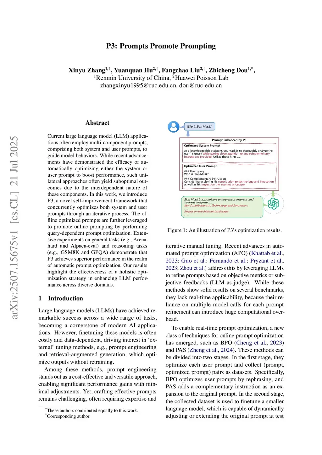 Current large language model (LLM) applications often employ multi-component prompts, comprising both system and user prompts, to guide model behaviors. While recent advancements have demonstrated the efficacy of automatically optimizing either the system or user prompt to boost performance, such unilateral approaches often yield suboptimal outcomes due to the interdependent nature of these components. In this work, we introduce P3, a novel self-improvement framework that concurrently optimizes both system and user prompts through an iterative process. The offline optimized prompts are further leveraged to promote online prompting by performing query-dependent prompt optimization. Extensive experiments on general tasks (e.g., Arena-hard and Alpaca-eval) and reasoning tasks (e.g., GSM8K and GPQA) demonstrate that P3 achieves superior performance in the realm of automatic prompt optimization. Our results highlight the effectiveness of a holistic optimization strategy in enhancing LLM performance across diverse domains.