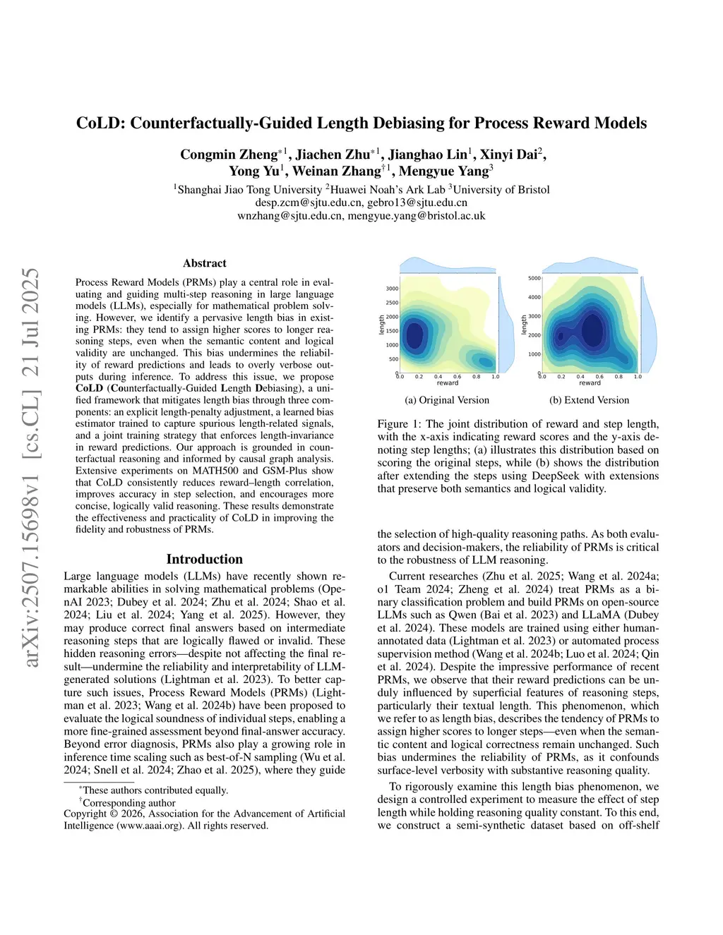 Process Reward Models (PRMs) play a central role in evaluating and guiding multi-step reasoning in large language models (LLMs), especially for mathematical problem solving. However, we identify a pervasive length bias in existing PRMs: they tend to assign higher scores to longer reasoning steps, even when the semantic content and logical validity are unchanged. This bias undermines the reliability of reward predictions and leads to overly verbose outputs during inference. To address this issue, we propose CoLD(Counterfactually-Guided Length Debiasing), a unified framework that mitigates length bias through three components: an explicit length-penalty adjustment, a learned bias estimator trained to capture spurious length-related signals, and a joint training strategy that enforces length-invariance in reward predictions. Our approach is grounded in counterfactual reasoning and informed by causal graph analysis. Extensive experiments on MATH500 and GSM-Plus show that CoLD consistently reduces reward-length correlation, improves accuracy in step selection, and encourages more concise, logically valid reasoning. These results demonstrate the effectiveness and practicality of CoLD in improving the fidelity and robustness of PRMs.