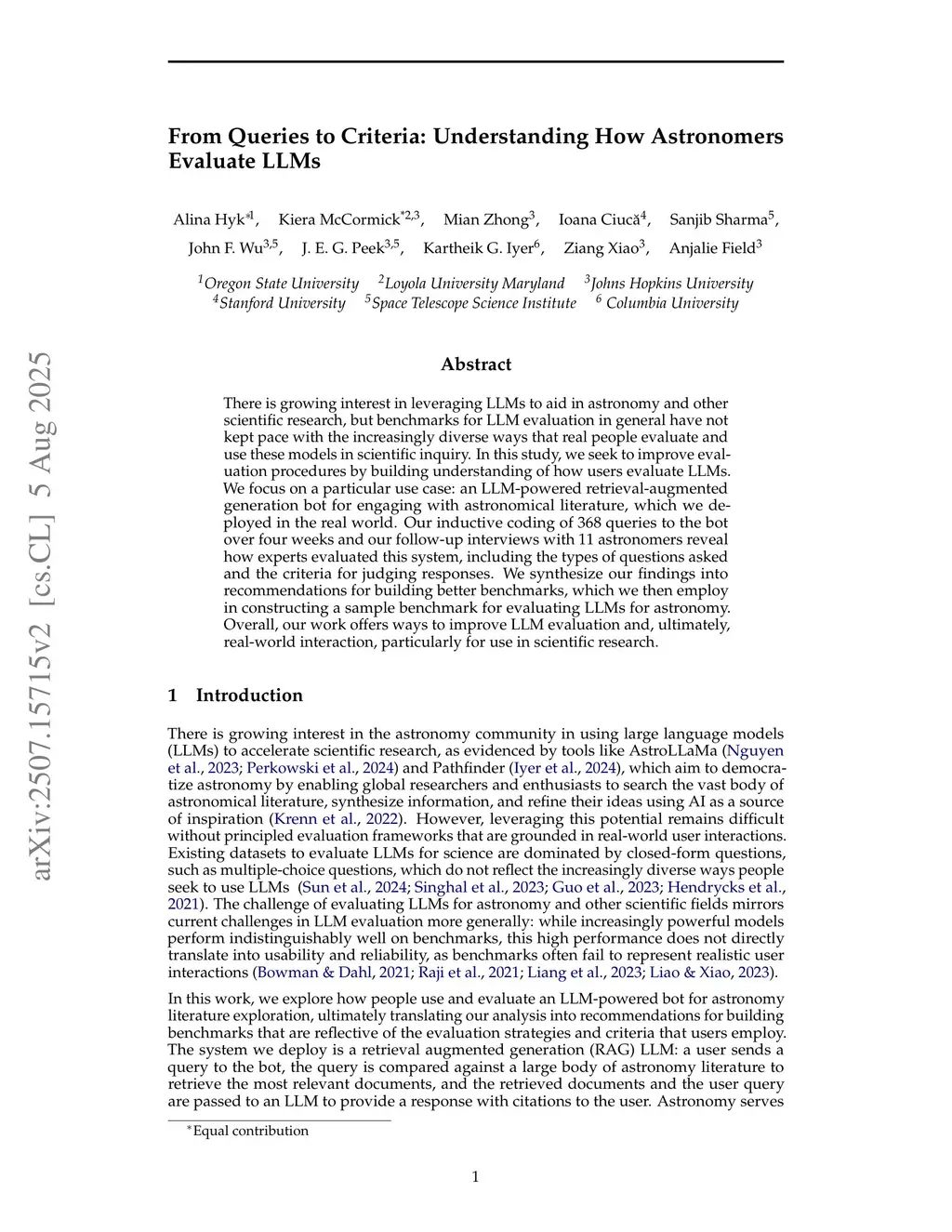 There is growing interest in leveraging LLMs to aid in astronomy and other scientific research, but benchmarks for LLM evaluation in general have not kept pace with the increasingly diverse ways that real people evaluate and use these models. In this study, we seek to improve evaluation procedures by building an understanding of how users evaluate LLMs. We focus on a particular use case: an LLM-powered retrieval-augmented generation bot for engaging with astronomical literature, which we deployed via Slack. Our inductive coding of 368 queries to the bot over four weeks and our follow-up interviews with 11 astronomers reveal how humans evaluated this system, including the types of questions asked and the criteria for judging responses. We synthesize our findings into concrete recommendations for building better benchmarks, which we then employ in constructing a sample benchmark for evaluating LLMs for astronomy. Overall, our work offers ways to improve LLM evaluation and ultimately usability, particularly for use in scientific research.