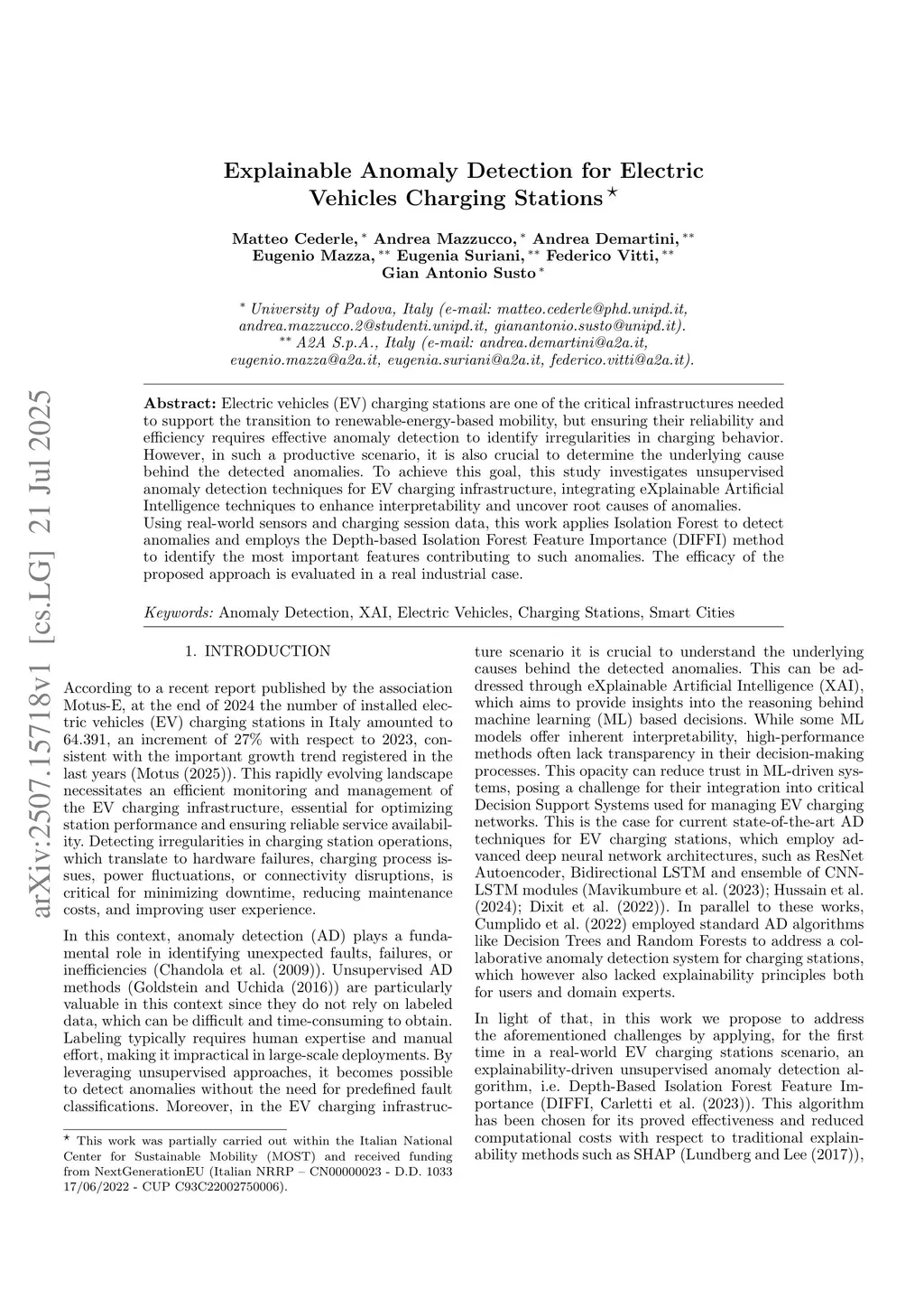 Electric vehicles (EV) charging stations are one of the critical infrastructures needed to support the transition to renewable-energy-based mobility, but ensuring their reliability and efficiency requires effective anomaly detection to identify irregularities in charging behavior. However, in such a productive scenario, it is also crucial to determine the underlying cause behind the detected anomalies. To achieve this goal, this study investigates unsupervised anomaly detection techniques for EV charging infrastructure, integrating eXplainable Artificial Intelligence techniques to enhance interpretability and uncover root causes of anomalies.Using real-world sensors and charging session data, this work applies Isolation Forest to detect anomalies and employs the Depth-based Isolation Forest Feature Importance (DIFFI) method to identify the most important features contributing to such anomalies. The efficacy of the proposed approach is evaluated in a real industrial case.