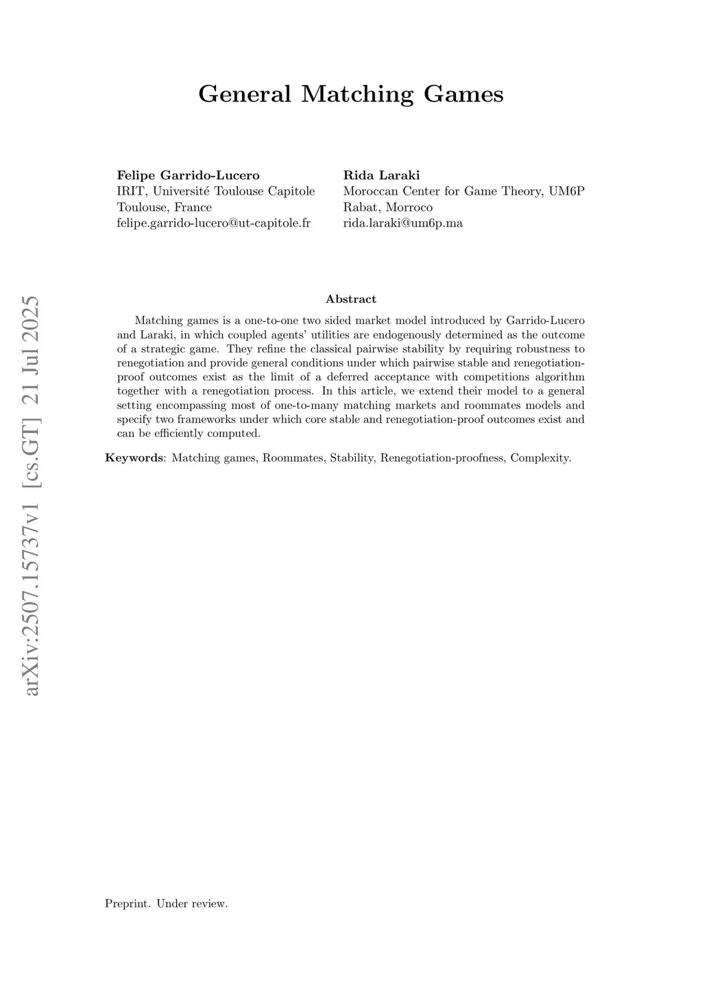 Matching games is a one-to-one two sided market model introduced by Garrido-Lucero and Laraki, in which coupled agents' utilities are endogenously determined as the outcome of a strategic game. They refine the classical pairwise stability by requiring robustness to renegotiation and provide general conditions under which pairwise stable and renegotiation-proof outcomes exist as the limit of a deferred acceptance with competitions algorithm together with a renegotiation process. In this article, we extend their model to a general setting encompassing most of one-to-many matching markets and roommates models and specify two frameworks under which core stable and renegotiation-proof outcomes exist and can be efficiently computed.