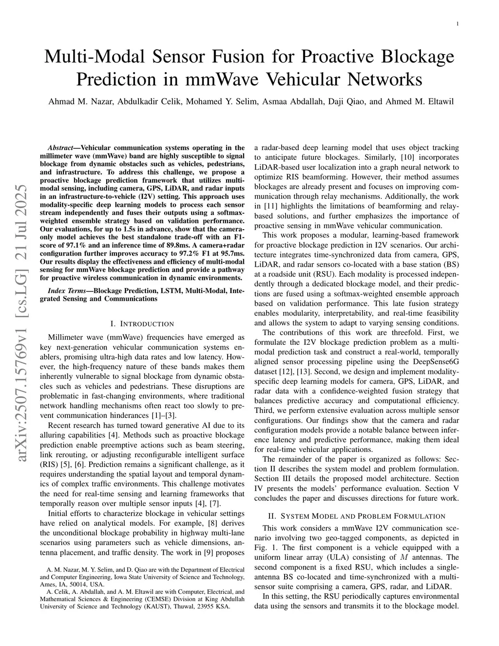 Vehicular communication systems operating in the millimeter wave (mmWave) band are highly susceptible to signal blockage from dynamic obstacles such as vehicles, pedestrians, and infrastructure. To address this challenge, we propose a proactive blockage prediction framework that utilizes multi-modal sensing, including camera, GPS, LiDAR, and radar inputs in an infrastructure-to-vehicle (I2V) setting. This approach uses modality-specific deep learning models to process each sensor stream independently and fuses their outputs using a softmax-weighted ensemble strategy based on validation performance. Our evaluations, for up to 1.5s in advance, show that the camera-only model achieves the best standalone trade-off with an F1-score of 97.1% and an inference time of 89.8ms. A camera+radar configuration further improves accuracy to 97.2% F1 at 95.7ms. Our results display the effectiveness and efficiency of multi-modal sensing for mmWave blockage prediction and provide a pathway for proactive wireless communication in dynamic environments.