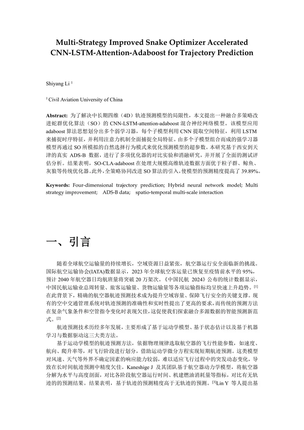 To address the limitations of medium- and long-term four-dimensional (4D) trajectory prediction models, this paper proposes a hybrid CNN-LSTM-attention-adaboost neural network model incorporating a multi-strategy improved snake-herd optimization (SO) algorithm. The model applies the Adaboost algorithm to divide multiple weak learners, and each submodel utilizes CNN to extract spatial features, LSTM to capture temporal features, and attention mechanism to capture global features comprehensively. The strong learner model, combined with multiple sub-models, then optimizes the hyperparameters of the prediction model through the natural selection behavior pattern simulated by SO. In this study, based on the real ADS-B data from Xián to Tianjin, the comparison experiments and ablation studies of multiple optimizers are carried out, and a comprehensive test and evaluation analysis is carried out. The results show that SO-CLA-adaboost outperforms traditional optimizers such as particle swarm, whale, and gray wolf in handling large-scale high-dimensional trajectory data. In addition, introducing the full-strategy collaborative improvement SO algorithm improves the model's prediction accuracy by 39.89%.