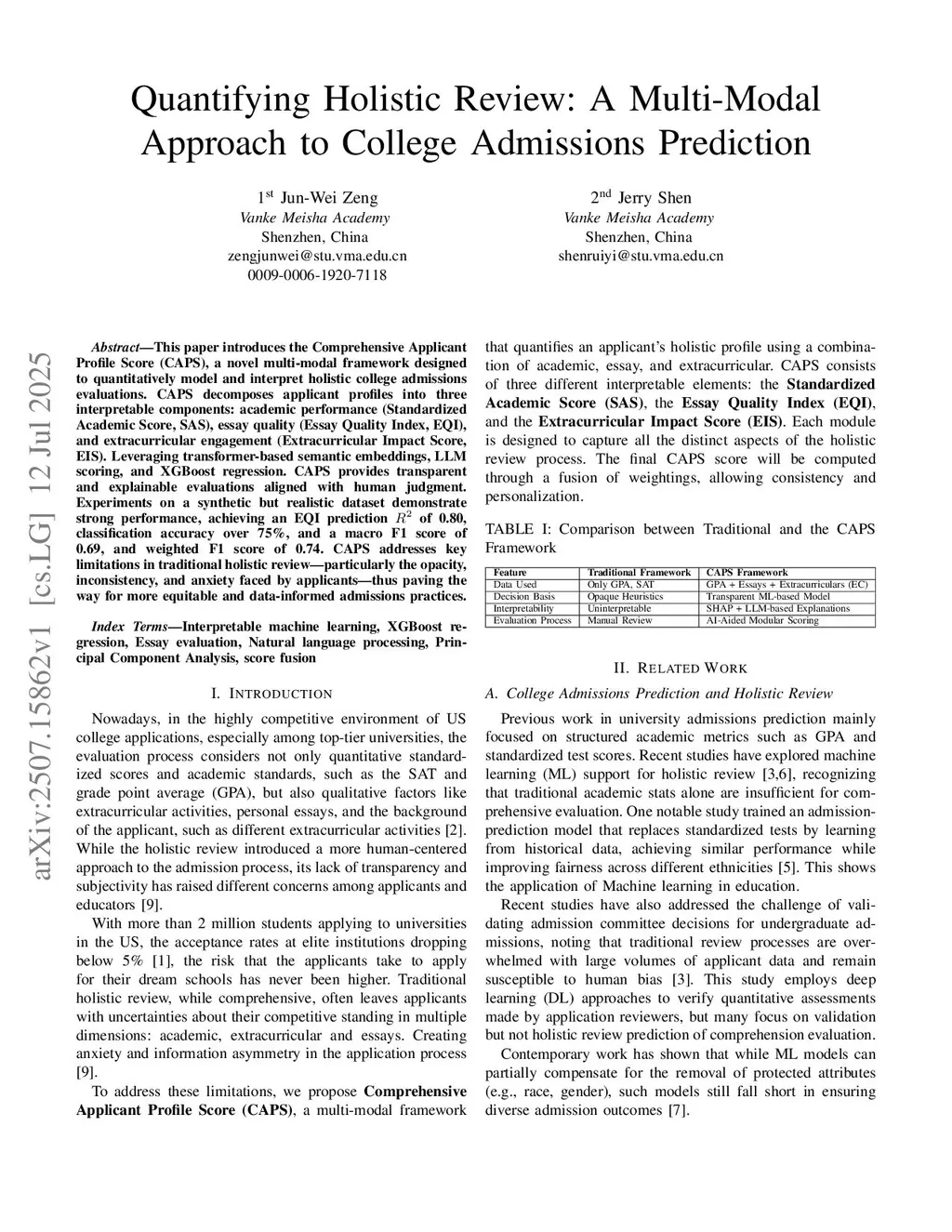 This paper introduces the Comprehensive Applicant Profile Score (CAPS), a novel multi-modal framework designed to quantitatively model and interpret holistic college admissions evaluations. CAPS decomposes applicant profiles into three interpretable components: academic performance (Standardized Academic Score, SAS), essay quality (Essay Quality Index, EQI), and extracurricular engagement (Extracurricular Impact Score, EIS). Leveraging transformer-based semantic embeddings, LLM scoring, and XGBoost regression, CAPS provides transparent and explainable evaluations aligned with human judgment. Experiments on a synthetic but realistic dataset demonstrate strong performance, achieving an EQI prediction R^2 of 0.80, classification accuracy over 75%, a macro F1 score of 0.69, and a weighted F1 score of 0.74. CAPS addresses key limitations in traditional holistic review -- particularly the opacity, inconsistency, and anxiety faced by applicants -- thus paving the way for more equitable and data-informed admissions practices.