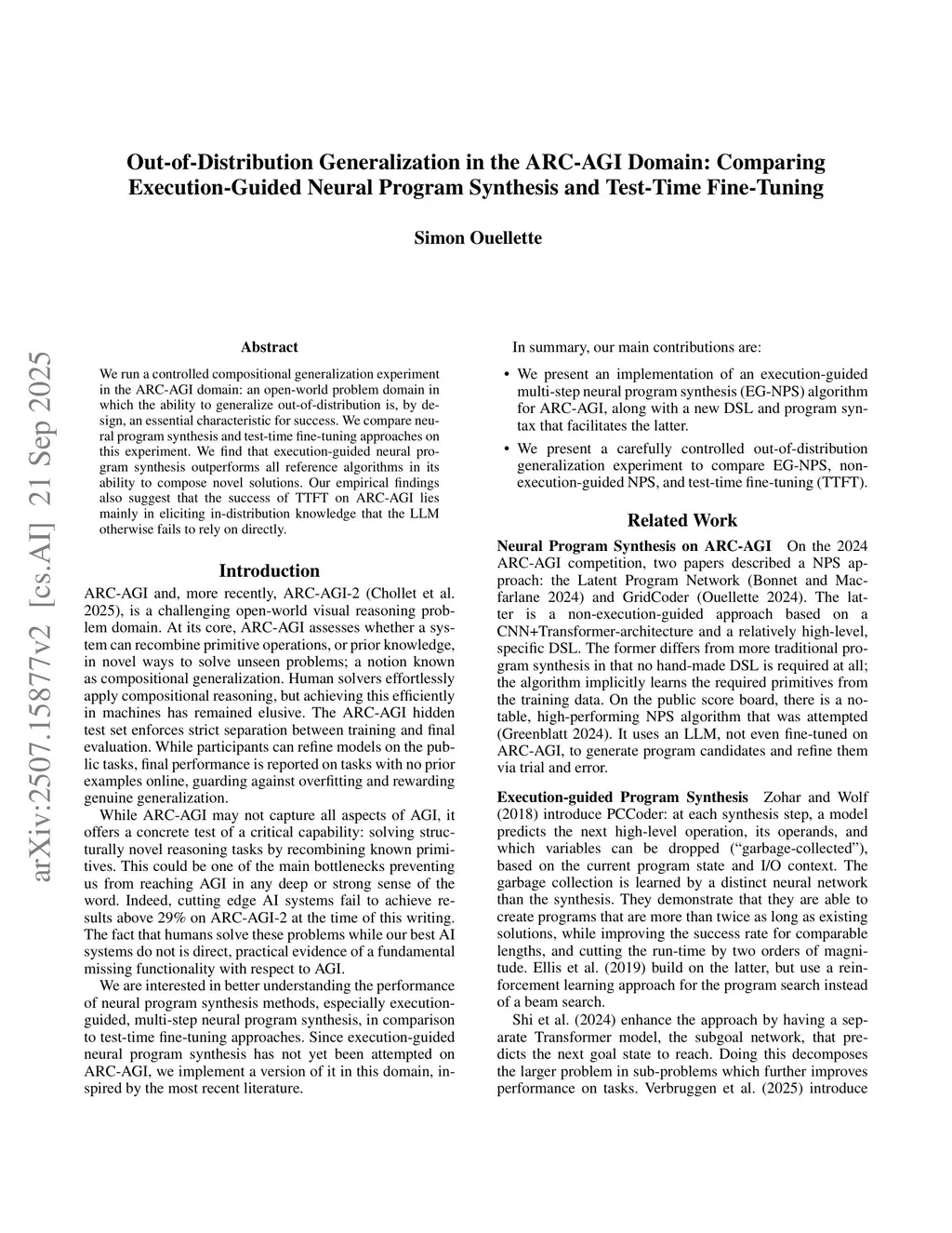 Out-of-Distribution Generalization in the ARC-AGI Domain: Comparing Execution-Guided Neural Program Synthesis and Test-Time Fine-Tuning