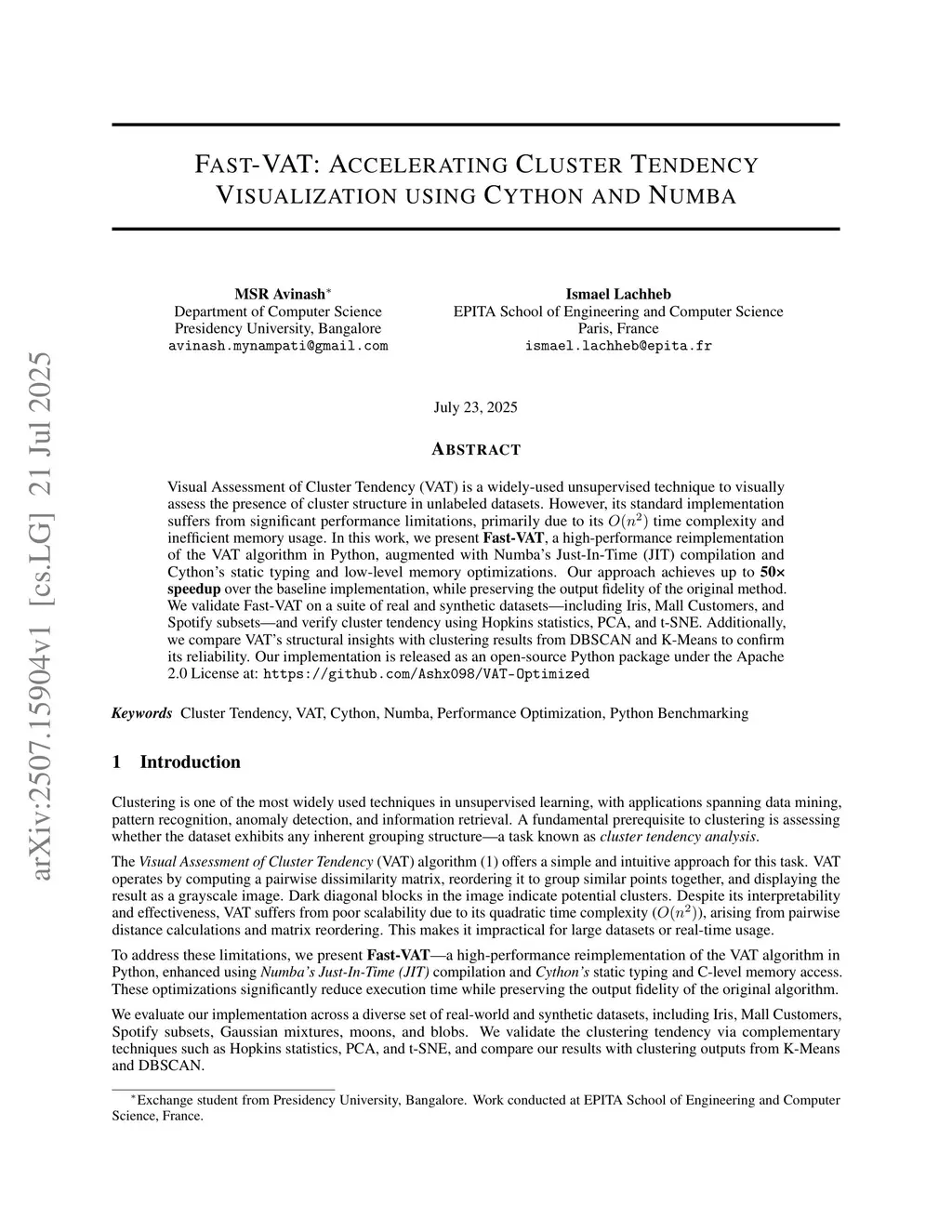 Fast-VAT: Accelerating Cluster Tendency Visualization using Cython and Numba