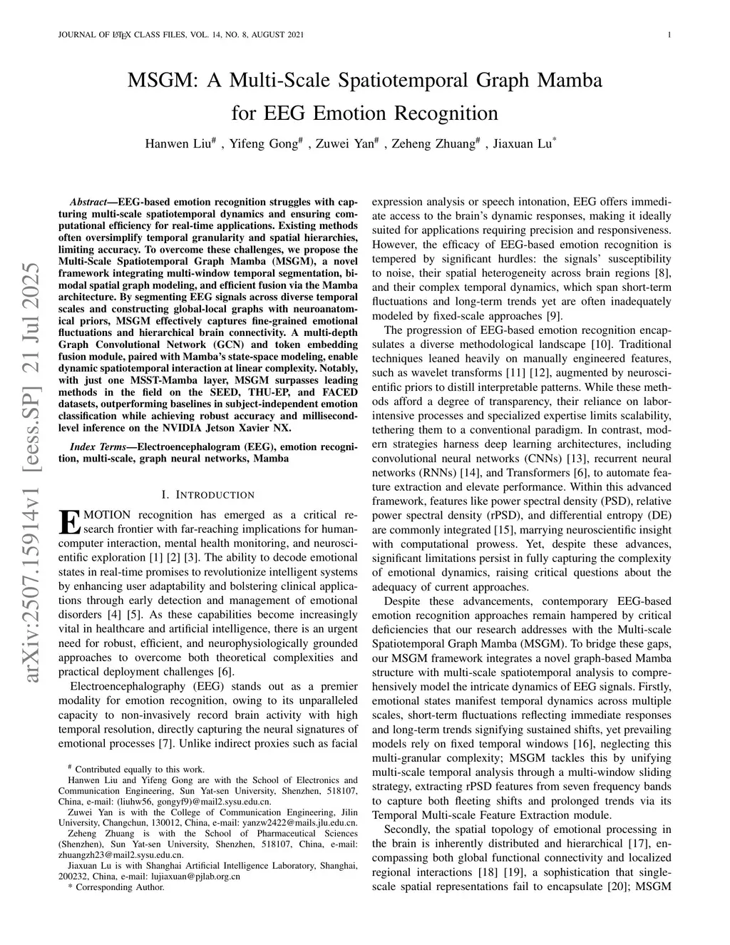 EEG-based emotion recognition struggles with capturing multi-scale spatiotemporal dynamics and ensuring computational efficiency for real-time applications. Existing methods often oversimplify temporal granularity and spatial hierarchies, limiting accuracy. To overcome these challenges, we propose the Multi-Scale Spatiotemporal Graph Mamba (MSGM), a novel framework integrating multi-window temporal segmentation, bimodal spatial graph modeling, and efficient fusion via the Mamba architecture. By segmenting EEG signals across diverse temporal scales and constructing global-local graphs with neuroanatomical priors, MSGM effectively captures fine-grained emotional fluctuations and hierarchical brain connectivity. A multi-depth Graph Convolutional Network (GCN) and token embedding fusion module, paired with Mamba's state-space modeling, enable dynamic spatiotemporal interaction at linear complexity. Notably, with just one MSST-Mamba layer, MSGM surpasses leading methods in the field on the SEED, THU-EP, and FACED datasets, outperforming baselines in subject-independent emotion classification while achieving robust accuracy and millisecond-level inference on the NVIDIA Jetson Xavier NX.