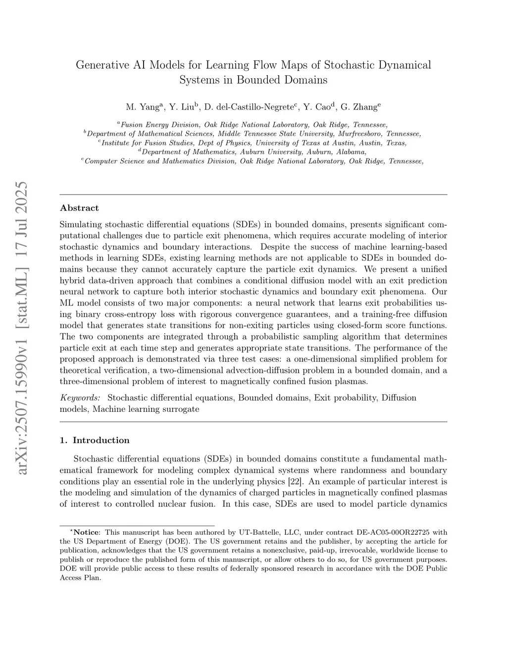 Simulating stochastic differential equations (SDEs) in bounded domains, presents significant computational challenges due to particle exit phenomena, which requires accurate modeling of interior stochastic dynamics and boundary interactions. Despite the success of machine learning-based methods in learning SDEs, existing learning methods are not applicable to SDEs in bounded domains because they cannot accurately capture the particle exit dynamics. We present a unified hybrid data-driven approach that combines a conditional diffusion model with an exit prediction neural network to capture both interior stochastic dynamics and boundary exit phenomena. Our ML model consists of two major components: a neural network that learns exit probabilities using binary cross-entropy loss with rigorous convergence guarantees, and a training-free diffusion model that generates state transitions for non-exiting particles using closed-form score functions. The two components are integrated through a probabilistic sampling algorithm that determines particle exit at each time step and generates appropriate state transitions. The performance of the proposed approach is demonstrated via three test cases: a one-dimensional simplified problem for theoretical verification, a two-dimensional advection-diffusion problem in a bounded domain, and a three-dimensional problem of interest to magnetically confined fusion plasmas.