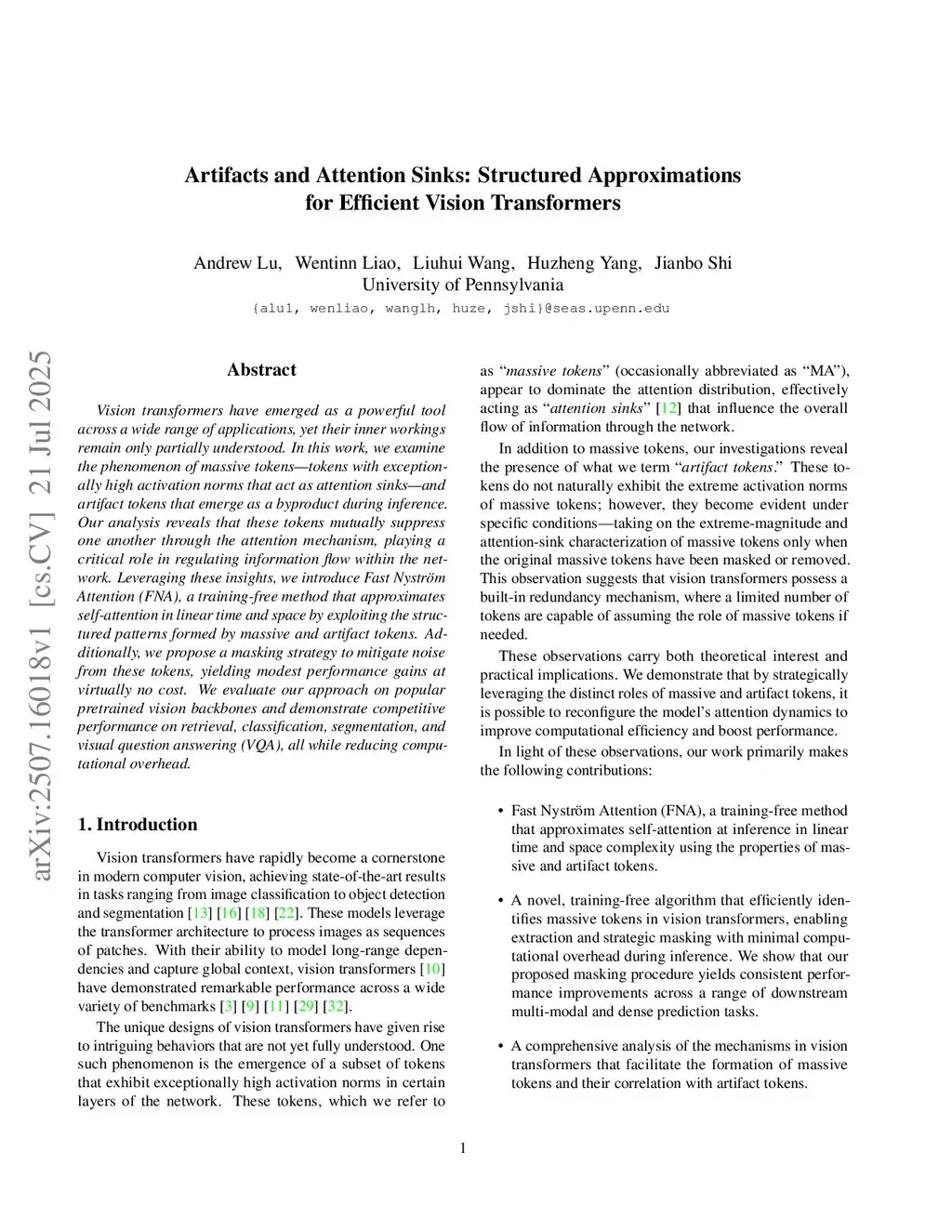 Vision transformers have emerged as a powerful tool across a wide range of applications, yet their inner workings remain only partially understood. In this work, we examine the phenomenon of massive tokens - tokens with exceptionally high activation norms that act as attention sinks - and artifact tokens that emerge as a byproduct during inference. Our analysis reveals that these tokens mutually suppress one another through the attention mechanism, playing a critical role in regulating information flow within the network. Leveraging these insights, we introduce Fast Nyström Attention (FNA), a training-free method that approximates self-attention in linear time and space by exploiting the structured patterns formed by massive and artifact tokens. Additionally, we propose a masking strategy to mitigate noise from these tokens, yielding modest performance gains at virtually no cost. We evaluate our approach on popular pretrained vision backbones and demonstrate competitive performance on retrieval, classification, segmentation, and visual question answering (VQA), all while reducing computational overhead.