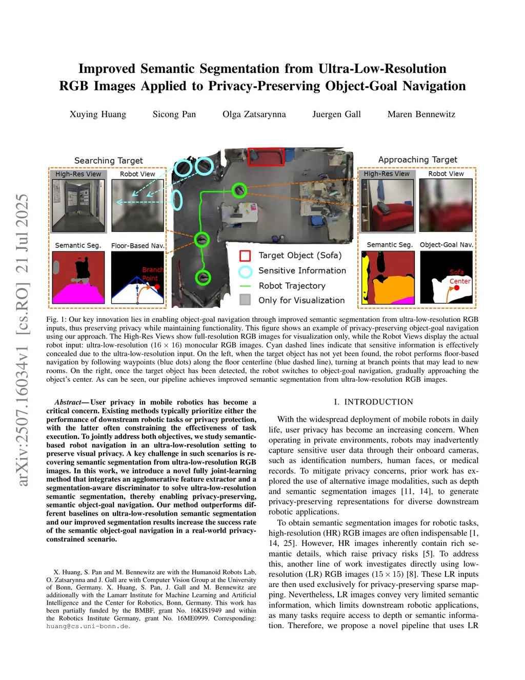 User privacy in mobile robotics has become a critical concern. Existing methods typically prioritize either the performance of downstream robotic tasks or privacy protection, with the latter often constraining the effectiveness of task execution. To jointly address both objectives, we study semantic-based robot navigation in an ultra-low-resolution setting to preserve visual privacy. A key challenge in such scenarios is recovering semantic segmentation from ultra-low-resolution RGB images. In this work, we introduce a novel fully joint-learning method that integrates an agglomerative feature extractor and a segmentation-aware discriminator to solve ultra-low-resolution semantic segmentation, thereby enabling privacy-preserving, semantic object-goal navigation. Our method outperforms different baselines on ultra-low-resolution semantic segmentation and our improved segmentation results increase the success rate of the semantic object-goal navigation in a real-world privacy-constrained scenario.