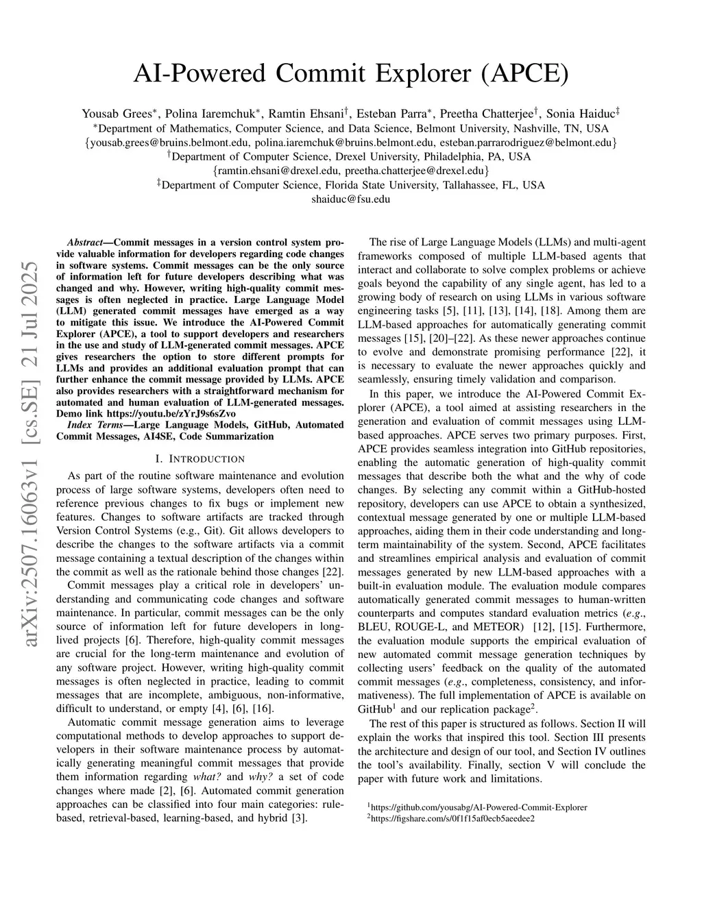 Commit messages in a version control system provide valuable information for developers regarding code changes in software systems. Commit messages can be the only source of information left for future developers describing what was changed and why. However, writing high-quality commit messages is often neglected in practice. Large Language Model (LLM) generated commit messages have emerged as a way to mitigate this issue. We introduce the AI-Powered Commit Explorer (APCE), a tool to support developers and researchers in the use and study of LLM-generated commit messages. APCE gives researchers the option to store different prompts for LLMs and provides an additional evaluation prompt that can further enhance the commit message provided by LLMs. APCE also provides researchers with a straightforward mechanism for automated and human evaluation of LLM-generated messages. Demo linkthis https URL