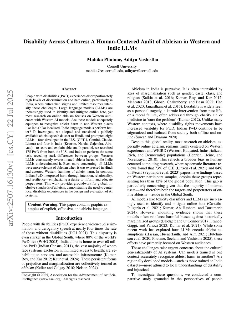 People with disabilities (PwD) experience disproportionately high levels of discrimination and hate online, particularly in India, where entrenched stigma and limited resources intensify these challenges. Large language models (LLMs) are increasingly used to identify and mitigate online hate, yet most research on online ableism focuses on Western audiences with Western AI models. Are these models adequately equipped to recognize ableist harm in non-Western places like India? Do localized, Indic language models perform better? To investigate, we adopted and translated a publicly available ableist speech dataset to Hindi, and prompted eight LLMs--four developed in the U.S. (GPT-4, Gemini, Claude, Llama) and four in India (Krutrim, Nanda, Gajendra, Airavata)--to score and explain ableism. In parallel, we recruited 175 PwD from both the U.S. and India to perform the same task, revealing stark differences between groups. Western LLMs consistently overestimated ableist harm, while Indic LLMs underestimated it. Even more concerning, all LLMs were more tolerant of ableism when it was expressed in Hindi and asserted Western framings of ableist harm. In contrast, Indian PwD interpreted harm through intention, relationality, and resilience--emphasizing a desire to inform and educate perpetrators. This work provides groundwork for global, inclusive standards of ableism, demonstrating the need to center local disability experiences in the design and evaluation of AI systems.