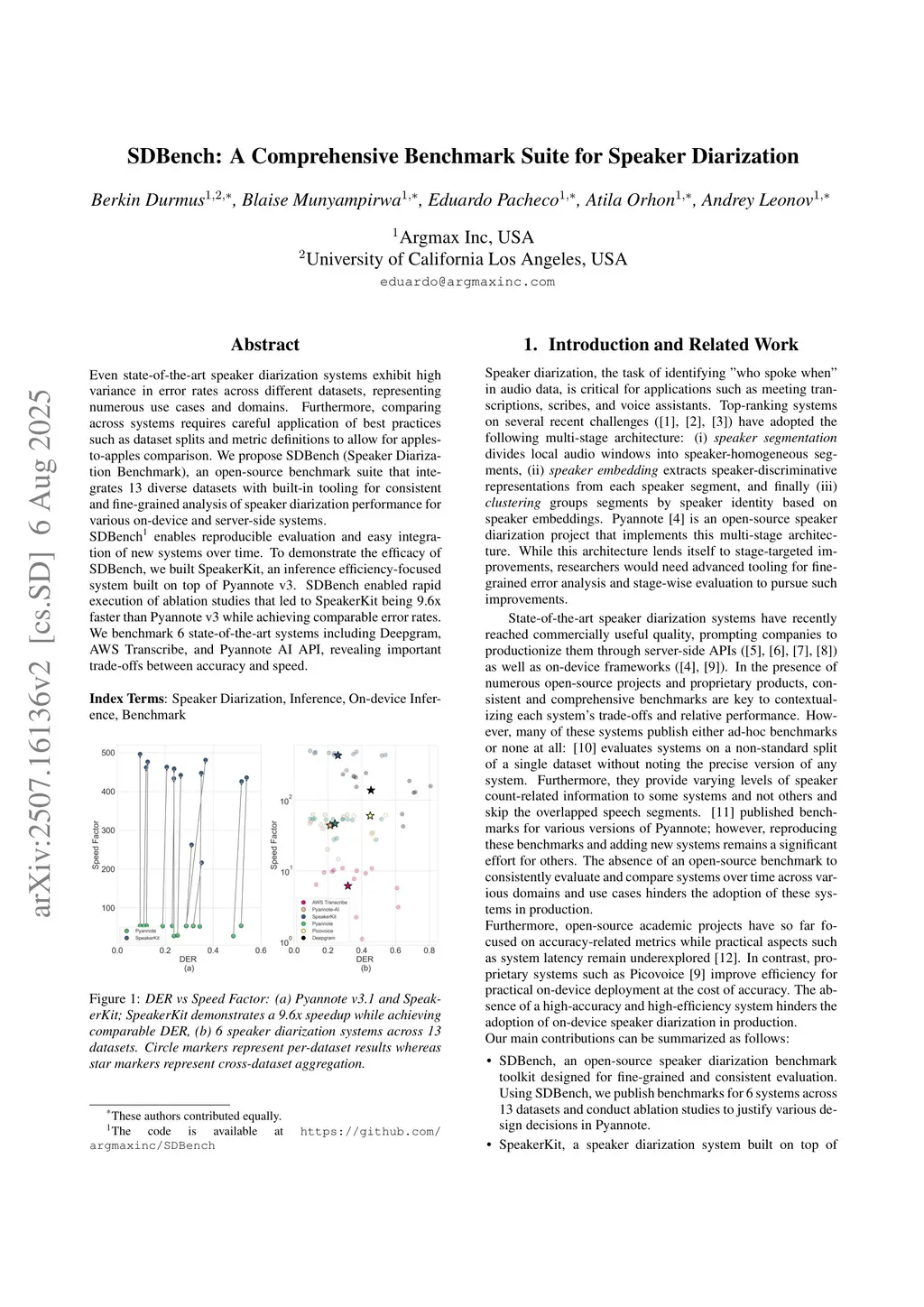 Even state-of-the-art speaker diarization systems exhibit high variance in error rates across different datasets, representing numerous use cases and domains. Furthermore, comparing across systems requires careful application of best practices such as dataset splits and metric definitions to allow for apples-to-apples comparison. We propose SDBench (Speaker Diarization Benchmark), an open-source benchmark suite that integrates 13 diverse datasets with built-in tooling for consistent and fine-grained analysis of speaker diarization performance for various on-device and server-side systems. SDBench enables reproducible evaluation and easy integration of new systems over time. To demonstrate the efficacy of SDBench, we built SpeakerKit, an inference efficiency-focused system built on top of Pyannote v3. SDBench enabled rapid execution of ablation studies that led to SpeakerKit being 9.6x faster than Pyannote v3 while achieving comparable error rates. We benchmark 6 state-of-the-art systems including Deepgram, AWS Transcribe, and Pyannote AI API, revealing important trade-offs between accuracy and speed.