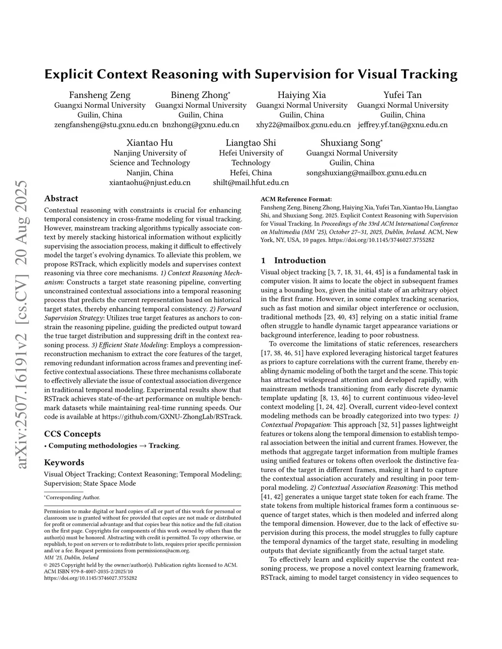 Contextual reasoning with constraints is crucial for enhancing temporal consistency in cross-frame modeling for visual tracking. However, mainstream tracking algorithms typically associate context by merely stacking historical information without explicitly supervising the association process, making it difficult to effectively model the target's evolving dynamics. To alleviate this problem, we propose RSTrack, which explicitly models and supervises context reasoning via three core mechanisms. \textit{1) Context Reasoning Mechanism}: Constructs a target state reasoning pipeline, converting unconstrained contextual associations into a temporal reasoning process that predicts the current representation based on historical target states, thereby enhancing temporal consistency. \textit{2) Forward Supervision Strategy}: Utilizes true target features as anchors to constrain the reasoning pipeline, guiding the predicted output toward the true target distribution and suppressing drift in the context reasoning process. \textit{3) Efficient State Modeling}: Employs a compression-reconstruction mechanism to extract the core features of the target, removing redundant information across frames and preventing ineffective contextual associations. These three mechanisms collaborate to effectively alleviate the issue of contextual association divergence in traditional temporal modeling. Experimental results show that RSTrack achieves state-of-the-art performance on multiple benchmark datasets while maintaining real-time running speeds. Our code is available atthis https URL.