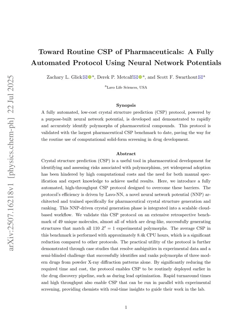 Crystal structure prediction (CSP) is a useful tool in pharmaceutical development for identifying and assessing risks associated with polymorphism, yet widespread adoption has been hindered by high computational costs and the need for both manual specification and expert knowledge to achieve useful results. Here, we introduce a fully automated, high-throughput CSP protocol designed to overcome these barriers. The protocol's efficiency is driven by Lavo-NN, a novel neural network potential (NNP) architected and trained specifically for pharmaceutical crystal structure generation and ranking. This NNP-driven crystal generation phase is integrated into a scalable cloud-based workflow. We validate this CSP protocol on an extensive retrospective benchmark of 49 unique molecules, almost all of which are drug-like, successfully generating structures that match all 110 experimental polymorphs. The average CSP in this benchmark is performed with approximately 8.4k CPU hours, which is a significant reduction compared to other protocols. The practical utility of the protocol is further demonstrated through case studies that resolve ambiguities in experimental data and a semi-blinded challenge that successfully identifies and ranks polymorphs of three modern drugs from powder X-ray diffraction patterns alone. By significantly reducing the required time and cost, the protocol enables CSP to be routinely deployed earlier in the drug discovery pipeline, such as during lead optimization. Rapid turnaround times and high throughput also enable CSP that can be run in parallel with experimental screening, providing chemists with real-time insights to guide their work in the lab.