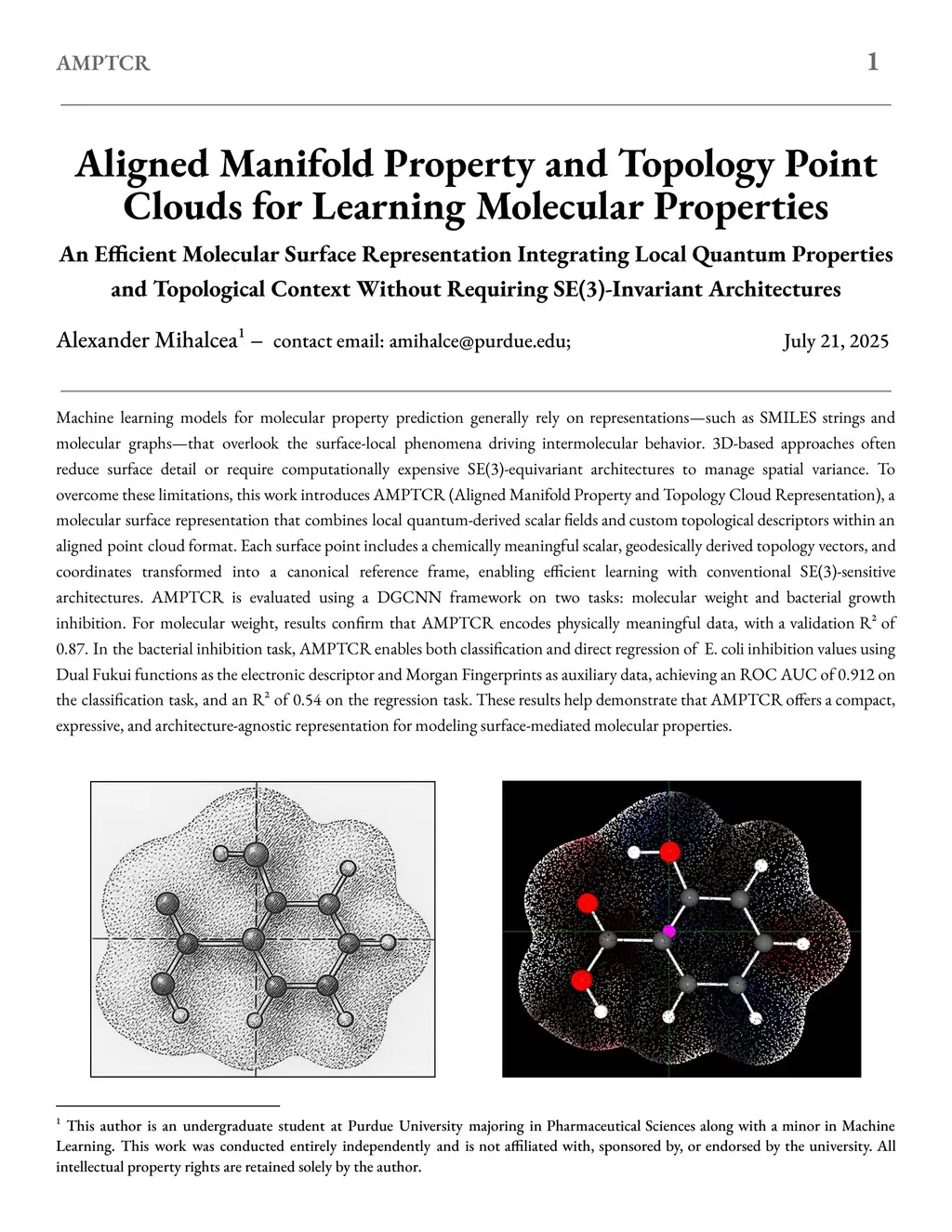 Machine learning models for molecular property prediction generally rely on representations -- such as SMILES strings and molecular graphs -- that overlook the surface-local phenomena driving intermolecular behavior. 3D-based approaches often reduce surface detail or require computationally expensive SE(3)-equivariant architectures to manage spatial variance. To overcome these limitations, this work introduces AMPTCR (Aligned Manifold Property and Topology Cloud Representation), a molecular surface representation that combines local quantum-derived scalar fields and custom topological descriptors within an aligned point cloud format. Each surface point includes a chemically meaningful scalar, geodesically derived topology vectors, and coordinates transformed into a canonical reference frame, enabling efficient learning with conventional SE(3)-sensitive architectures. AMPTCR is evaluated using a DGCNN framework on two tasks: molecular weight and bacterial growth inhibition. For molecular weight, results confirm that AMPTCR encodes physically meaningful data, with a validation R^2 of 0.87. In the bacterial inhibition task, AMPTCR enables both classification and direct regression of E. coli inhibition values using Dual Fukui functions as the electronic descriptor and Morgan Fingerprints as auxiliary data, achieving an ROC AUC of 0.912 on the classification task, and an R^2 of 0.54 on the regression task. These results help demonstrate that AMPTCR offers a compact, expressive, and architecture-agnostic representation for modeling surface-mediated molecular properties.