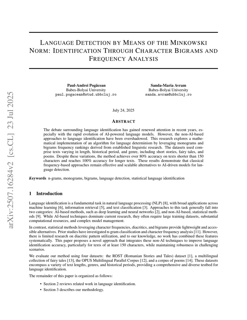 Language Detection by Means of the Minkowski Norm: Identification Through Character Bigrams and Frequency Analysis