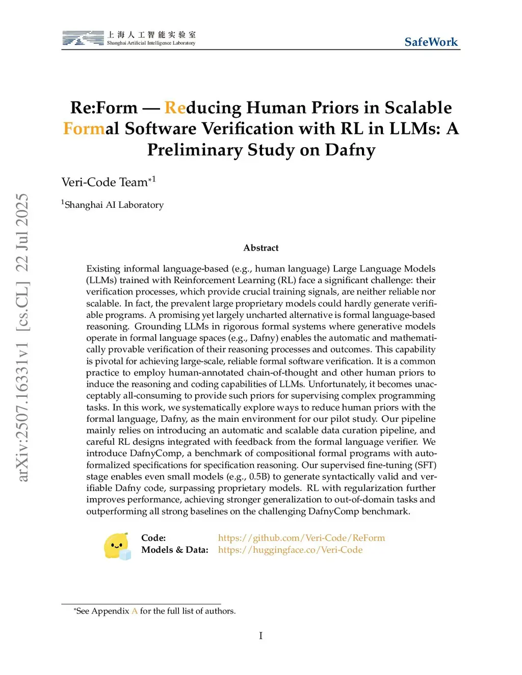 Existing informal language-based (e.g., human language) Large Language Models (LLMs) trained with Reinforcement Learning (RL) face a significant challenge: their verification processes, which provide crucial training signals, are neither reliable nor scalable. In fact, the prevalent large proprietary models could hardly generate verifiable programs. A promising yet largely uncharted alternative is formal language-based reasoning. Grounding LLMs in rigorous formal systems where generative models operate in formal language spaces (e.g., Dafny) enables the automatic and mathematically provable verification of their reasoning processes and outcomes. This capability is pivotal for achieving large-scale, reliable formal software verification. It is a common practice to employ human-annotated chain-of-thought and other human priors to induce the reasoning and coding capabilities of LLMs. Unfortunately, it becomes unacceptably all-consuming to provide such priors for supervising complex programming tasks. In this work, we systematically explore ways to reduce human priors with the formal language, Dafny, as the main environment for our pilot study. Our pipeline mainly relies on introducing an automatic and scalable data curation pipeline, and careful RL designs integrated with feedback from the formal language verifier. We introduce DafnyComp, a benchmark of compositional formal programs with auto-formalized specifications for specification reasoning. Our supervised fine-tuning (SFT) stage enables even small models (e.g., 0.5B) to generate syntactically valid and verifiable Dafny code, surpassing proprietary models. RL with regularization further improves performance, achieving stronger generalization to out-of-domain tasks and outperforming all strong baselines on the challenging DafnyComp benchmark.