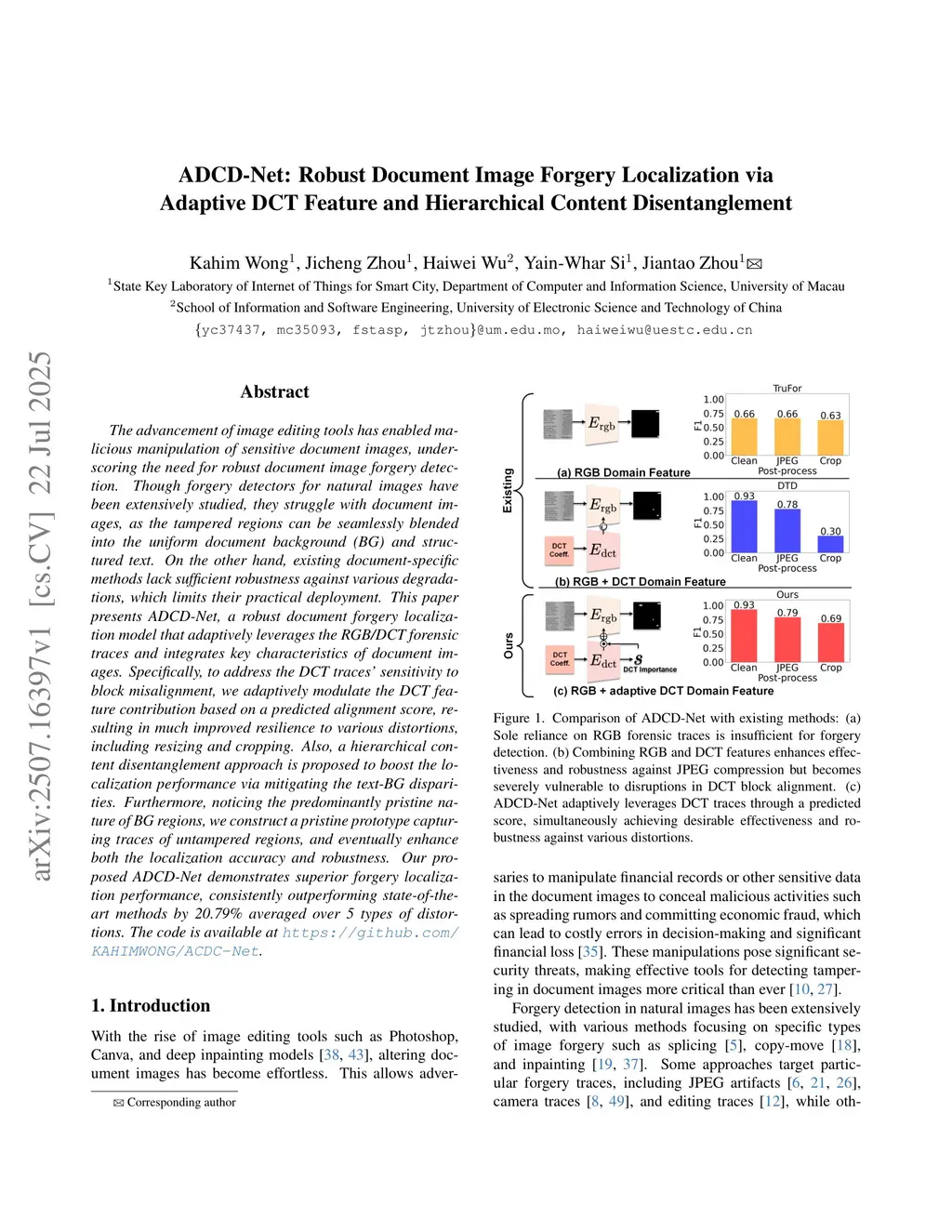 ADCD-Net: Robust Document Image Forgery Localization via Adaptive DCT Feature and Hierarchical Content Disentanglement