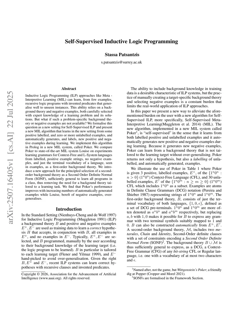 Inductive Logic Programming (ILP) approaches like Meta \-/ Interpretive Learning (MIL) can learn, from few examples, recursive logic programs with invented predicates that generalise well to unseen instances. This ability relies on a background theory and negative examples, both carefully selected with expert knowledge of a learning problem and its solutions. But what if such a problem-specific background theory or negative examples are not available? We formalise this question as a new setting for Self-Supervised ILP and present a new MIL algorithm that learns in the new setting from some positive labelled, and zero or more unlabelled examples, and automatically generates, and labels, new positive and negative examples during learning. We implement this algorithm in Prolog in a new MIL system, called Poker. We compare Poker to state-of-the-art MIL system Louise on experiments learning grammars for Context-Free and L-System languages from labelled, positive example strings, no negative examples, and just the terminal vocabulary of a language, seen in examples, as a first-order background theory. We introduce a new approach for the principled selection of a second-order background theory as a Second Order Definite Normal Form (SONF), sufficiently general to learn all programs in a class, thus removing the need for a backgound theory tailored to a learning task. We find that Poker's performance improves with increasing numbers of automatically generated examples while Louise, bereft of negative examples, over-generalises.