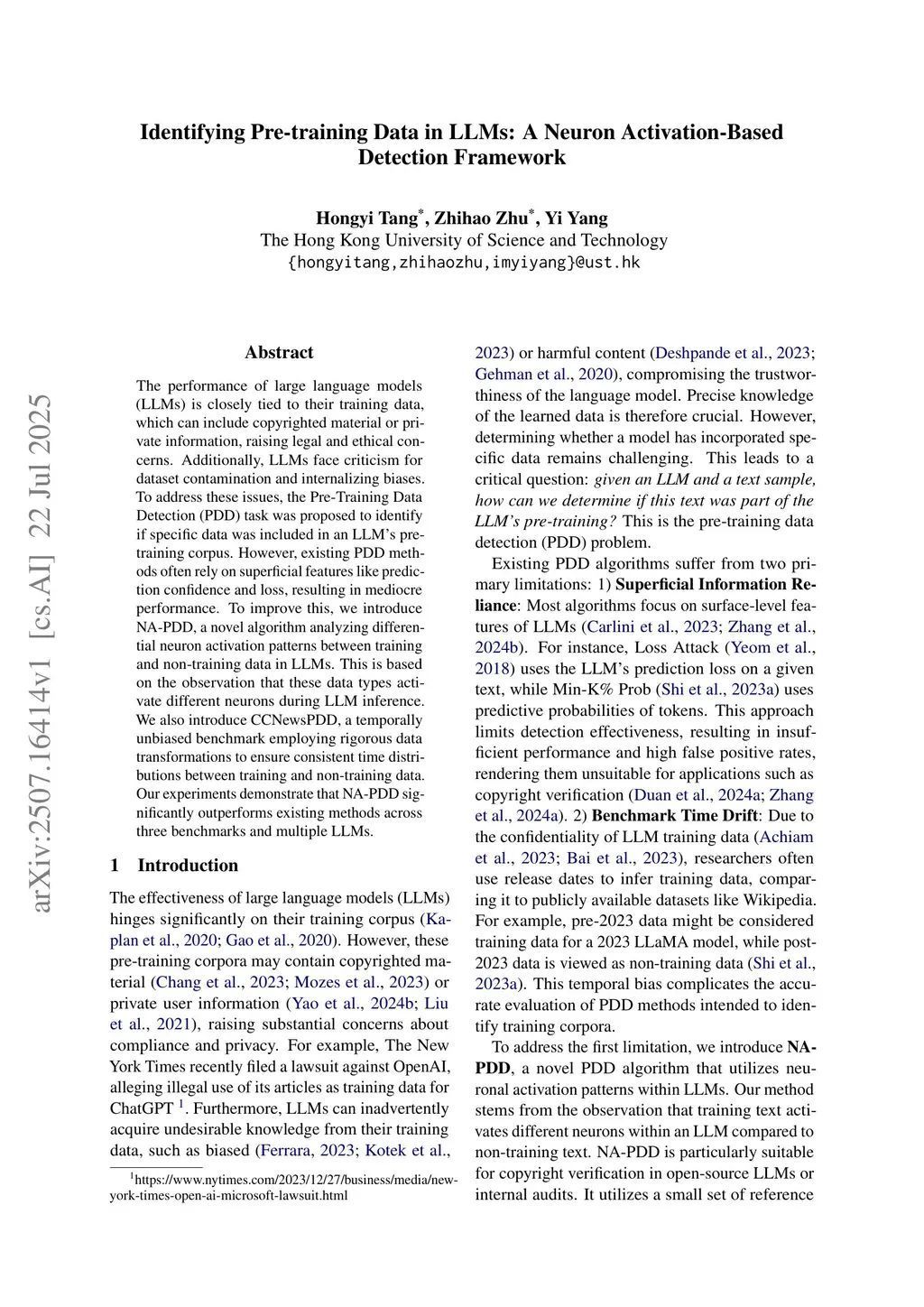 The performance of large language models (LLMs) is closely tied to their training data, which can include copyrighted material or private information, raising legal and ethical concerns. Additionally, LLMs face criticism for dataset contamination and internalizing biases. To address these issues, the Pre-Training Data Detection (PDD) task was proposed to identify if specific data was included in an LLM's pre-training corpus. However, existing PDD methods often rely on superficial features like prediction confidence and loss, resulting in mediocre performance. To improve this, we introduce NA-PDD, a novel algorithm analyzing differential neuron activation patterns between training and non-training data in LLMs. This is based on the observation that these data types activate different neurons during LLM inference. We also introduce CCNewsPDD, a temporally unbiased benchmark employing rigorous data transformations to ensure consistent time distributions between training and non-training data. Our experiments demonstrate that NA-PDD significantly outperforms existing methods across three benchmarks and multiple LLMs.