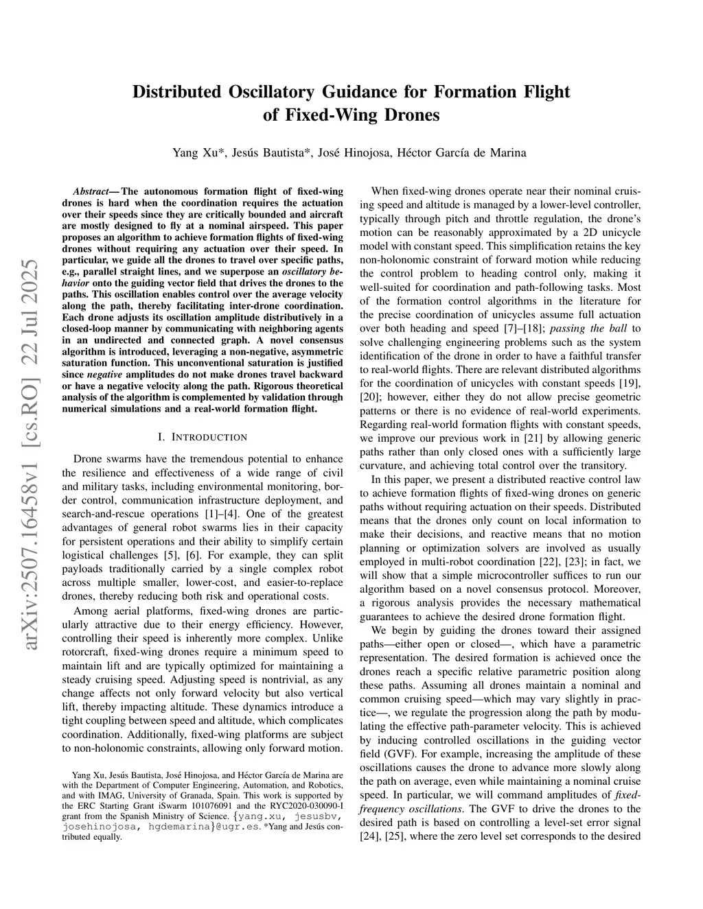 The autonomous formation flight of fixed-wing drones is hard when the coordination requires the actuation over their speeds since they are critically bounded and aircraft are mostly designed to fly at a nominal airspeed. This paper proposes an algorithm to achieve formation flights of fixed-wing drones without requiring any actuation over their speed. In particular, we guide all the drones to travel over specific paths, e.g., parallel straight lines, and we superpose an oscillatory behavior onto the guiding vector field that drives the drones to the paths. This oscillation enables control over the average velocity along the path, thereby facilitating inter-drone coordination. Each drone adjusts its oscillation amplitude distributively in a closed-loop manner by communicating with neighboring agents in an undirected and connected graph. A novel consensus algorithm is introduced, leveraging a non-negative, asymmetric saturation function. This unconventional saturation is justified since negative amplitudes do not make drones travel backward or have a negative velocity along the path. Rigorous theoretical analysis of the algorithm is complemented by validation through numerical simulations and a real-world formation flight.