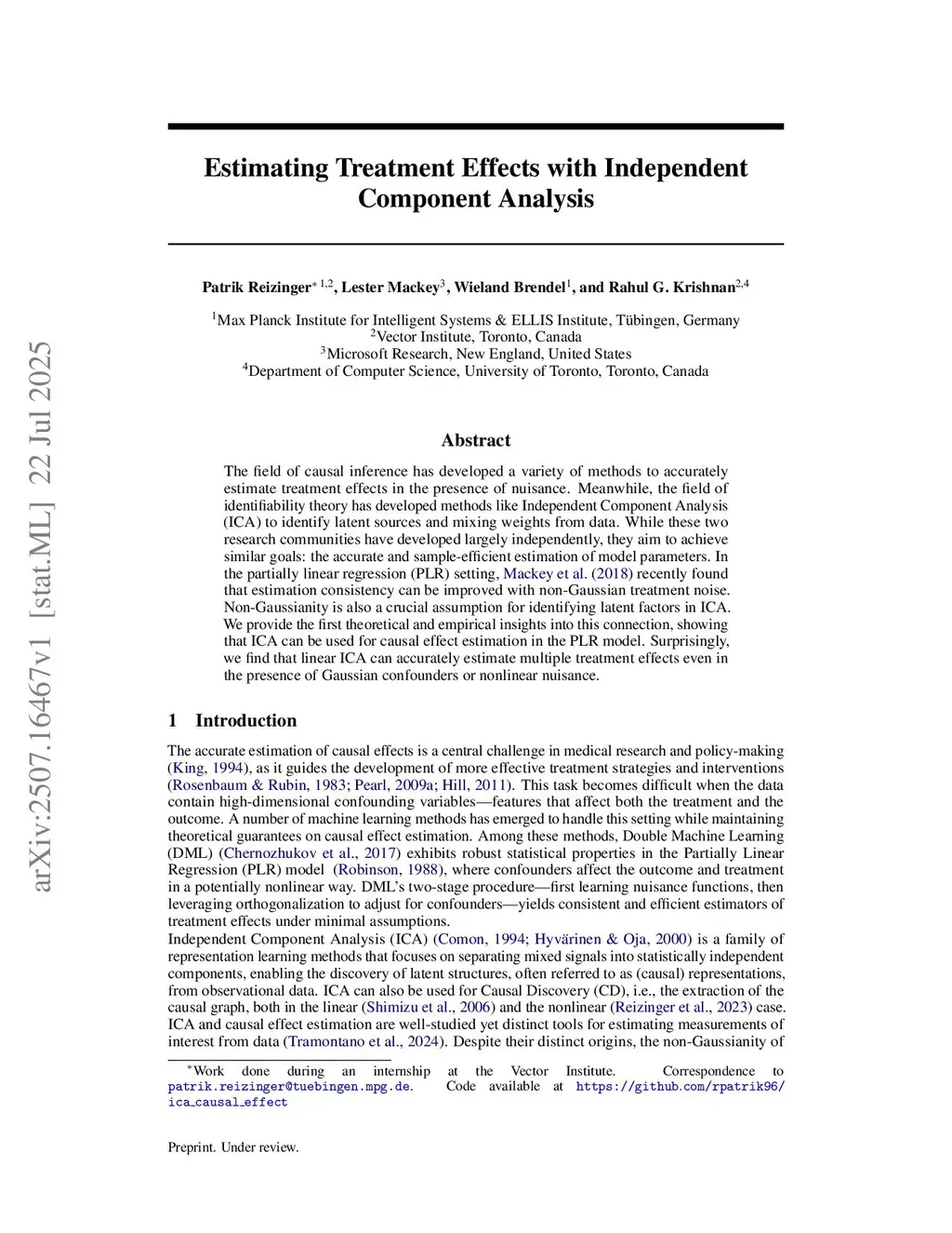 The field of causal inference has developed a variety of methods to accurately estimate treatment effects in the presence of nuisance. Meanwhile, the field of identifiability theory has developed methods like Independent Component Analysis (ICA) to identify latent sources and mixing weights from data. While these two research communities have developed largely independently, they aim to achieve similar goals: the accurate and sample-efficient estimation of model parameters. In the partially linear regression (PLR) setting, Mackey et al. (2018) recently found that estimation consistency can be improved with non-Gaussian treatment noise. Non-Gaussianity is also a crucial assumption for identifying latent factors in ICA. We provide the first theoretical and empirical insights into this connection, showing that ICA can be used for causal effect estimation in the PLR model. Surprisingly, we find that linear ICA can accurately estimate multiple treatment effects even in the presence of Gaussian confounders or nonlinear nuisance.