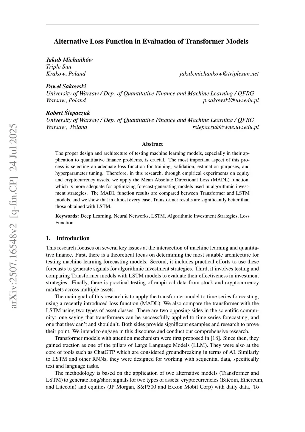 The proper design and architecture of testing machine learning models, especially in their application to quantitative finance problems, is crucial. The most important aspect of this process is selecting an adequate loss function for training, validation, estimation purposes, and hyperparameter tuning. Therefore, in this research, through empirical experiments on equity and cryptocurrency assets, we apply the Mean Absolute Directional Loss (MADL) function, which is more adequate for optimizing forecast-generating models used in algorithmic investment strategies. The MADL function results are compared between Transformer and LSTM models, and we show that in almost every case, Transformer results are significantly better than those obtained with LSTM.