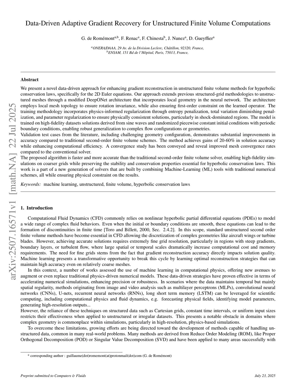 We present a novel data-driven approach for enhancing gradient reconstruction in unstructured finite volume methods for hyperbolic conservation laws, specifically for the 2D Euler equations. Our approach extends previous structured-grid methodologies to unstructured meshes through a modified DeepONet architecture that incorporates local geometry in the neural network. The architecture employs local mesh topology to ensure rotation invariance, while also ensuring first-order constraint on the learned operator. The training methodology incorporates physics-informed regularization through entropy penalization, total variation diminishing penalization, and parameter regularization to ensure physically consistent solutions, particularly in shock-dominated regions. The model is trained on high-fidelity datasets solutions derived from sine waves and randomized piecewise constant initial conditions with periodic boundary conditions, enabling robust generalization to complex flow configurations or geometries. Validation test cases from the literature, including challenging geometry configuration, demonstrates substantial improvements in accuracy compared to traditional second-order finite volume schemes. The method achieves gains of 20-60% in solution accuracy while enhancing computational efficiency. A convergence study has been conveyed and reveal improved mesh convergence rates compared to the conventional solver. The proposed algorithm is faster and more accurate than the traditional second-order finite volume solver, enabling high-fidelity simulations on coarser grids while preserving the stability and conservation properties essential for hyperbolic conservation laws. This work is a part of a new generation of solvers that are built by combining Machine-Learning (ML) tools with traditional numerical schemes, all while ensuring physical constraint on the results.