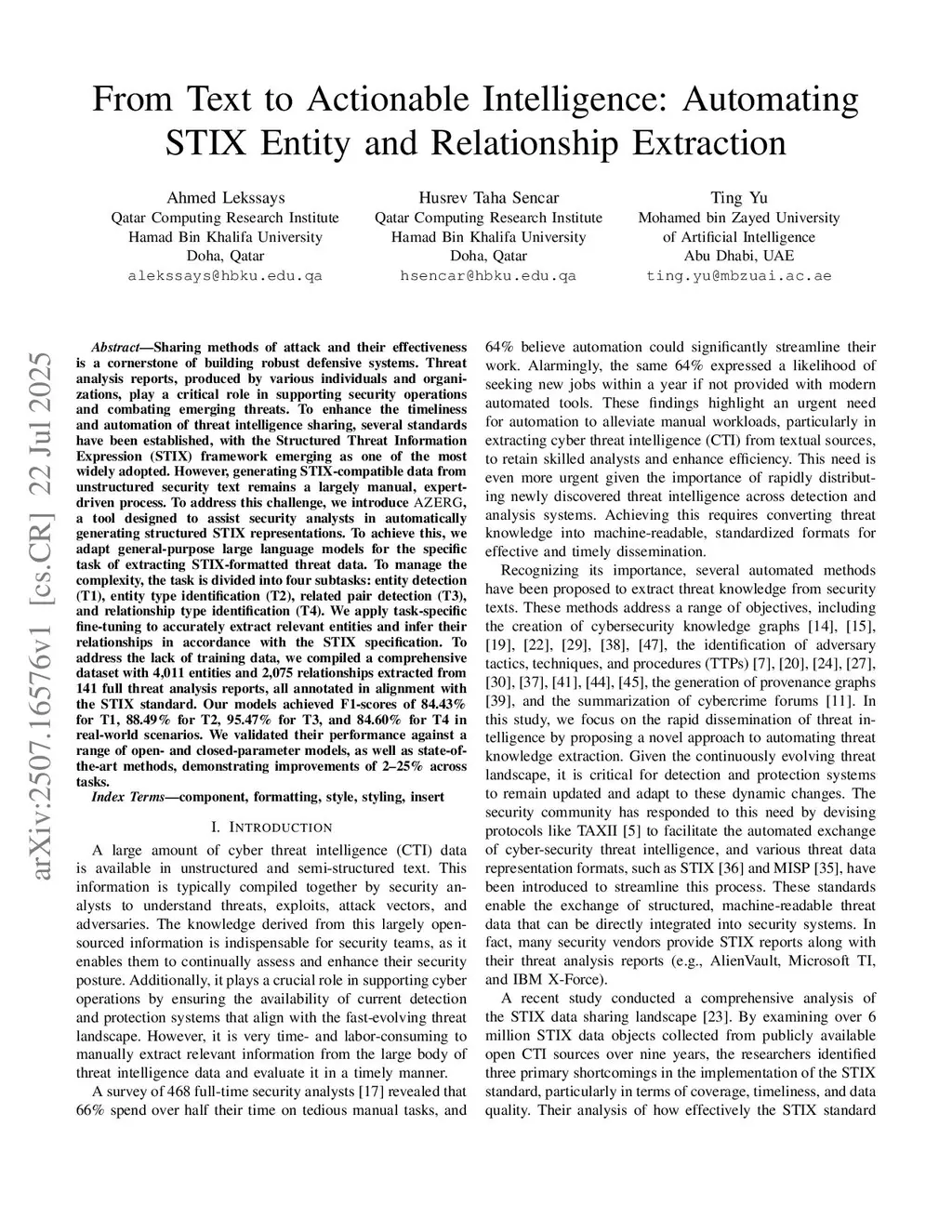 Sharing methods of attack and their effectiveness is a cornerstone of building robust defensive systems. Threat analysis reports, produced by various individuals and organizations, play a critical role in supporting security operations and combating emerging threats. To enhance the timeliness and automation of threat intelligence sharing, several standards have been established, with the Structured Threat Information Expression (STIX) framework emerging as one of the most widely adopted. However, generating STIX-compatible data from unstructured security text remains a largely manual, expert-driven process. To address this challenge, we introduce AZERG, a tool designed to assist security analysts in automatically generating structured STIX representations. To achieve this, we adapt general-purpose large language models for the specific task of extracting STIX-formatted threat data. To manage the complexity, the task is divided into four subtasks: entity detection (T1), entity type identification (T2), related pair detection (T3), and relationship type identification (T4). We apply task-specific fine-tuning to accurately extract relevant entities and infer their relationships in accordance with the STIX specification. To address the lack of training data, we compiled a comprehensive dataset with 4,011 entities and 2,075 relationships extracted from 141 full threat analysis reports, all annotated in alignment with the STIX standard. Our models achieved F1-scores of 84.43% for T1, 88.49% for T2, 95.47% for T3, and 84.60% for T4 in real-world scenarios. We validated their performance against a range of open- and closed-parameter models, as well as state-of-the-art methods, demonstrating improvements of 2-25% across tasks.