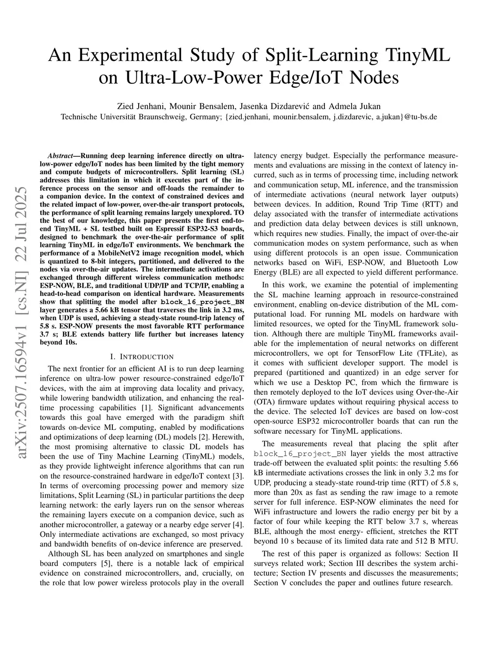 Running deep learning inference directly on ultra-low-power edge/IoT nodes has been limited by the tight memory and compute budgets of microcontrollers. Split learning (SL) addresses this limitation in which it executes part of the inference process on the sensor and off-loads the remainder to a companion device. In the context of constrained devices and the related impact of low-power, over-the-air transport protocols, the performance of split learning remains largely unexplored. TO the best of our knowledge, this paper presents the first end-to-end TinyML + SL testbed built on Espressif ESP32-S3 boards, designed to benchmark the over-the-air performance of split learning TinyML in edge/IoT environments. We benchmark the performance of a MobileNetV2 image recognition model, which is quantized to 8-bit integers, partitioned, and delivered to the nodes via over-the-air updates. The intermediate activations are exchanged through different wireless communication methods: ESP-NOW, BLE, and traditional UDP/IP and TCP/IP, enabling a head-to-head comparison on identical hardware. Measurements show that splitting the model after block_16_project_BN layer generates a 5.66 kB tensor that traverses the link in 3.2 ms, when UDP is used, achieving a steady-state round-trip latency of 5.8 s. ESP-NOW presents the most favorable RTT performance 3.7 s; BLE extends battery life further but increases latency beyond 10s.