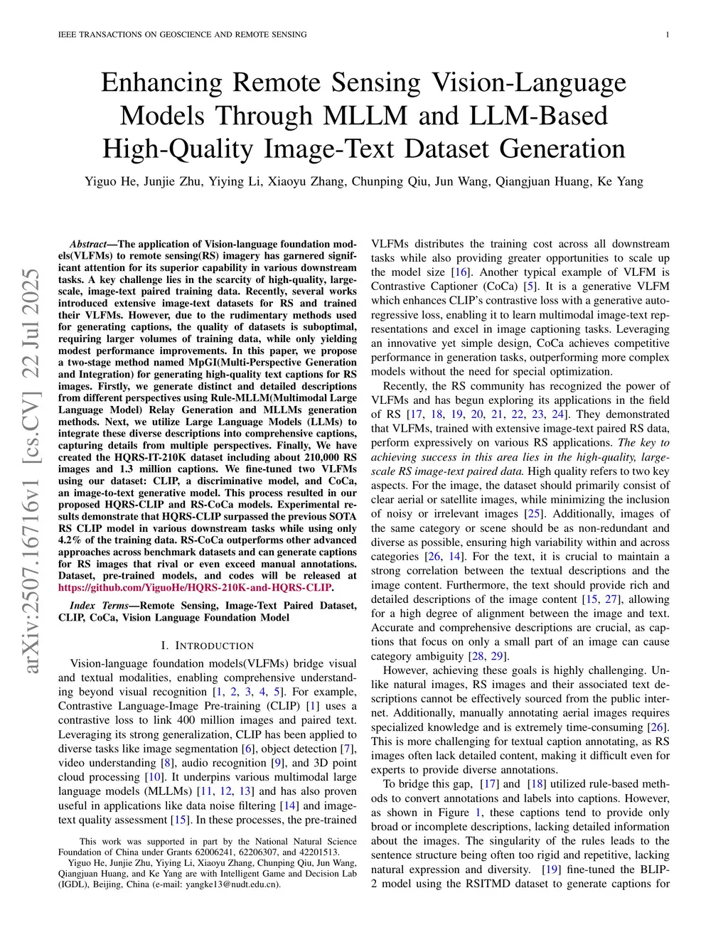 The application of Vision-language foundation models (VLFMs) to remote sensing (RS) imagery has garnered significant attention due to their superior capability in various downstream tasks. A key challenge lies in the scarcity of high-quality, large-scale, image-text paired training data. Recently, several works introduced extensive image-text datasets for RS and trained their VLFMs. However, due to the rudimentary methods used for generating captions, the quality of datasets is suboptimal, requiring larger volumes of training data, while only yielding modest performance improvements. In this paper, we propose a two-stage method named MpGI(Multi-Perspective Generation and Integration) for generating high-quality text captions for RS images. Firstly, we generate distinct and detailed descriptions from different perspectives using Rule-MLLM(Multimodal Large Language Model) Relay Generation and MLLMs generation methods. Next, we utilize Large Language Models (LLMs) to integrate these diverse descriptions into comprehensive captions, capturing details from multiple perspectives. Finally, we have created the HQRS-IT-210K dataset, including about 210,000 RS images and 1.3 million captions. We fine-tuned two VLFMs using our dataset: CLIP, a discriminative model, and CoCa, an image-to-text generative model. This process resulted in our proposed HQRS-CLIP and RS-CoCa models. Experimental results demonstrate that HQRS-CLIP surpassed the previous SOTA RS CLIP model in various downstream tasks while using only 4.2\% of the training data. RS-CoCa outperforms other advanced approaches across benchmark datasets and can generate captions for RS images that rival or even exceed manual annotations. Dataset, pre-trained models, and codes will be released atthis https URL.