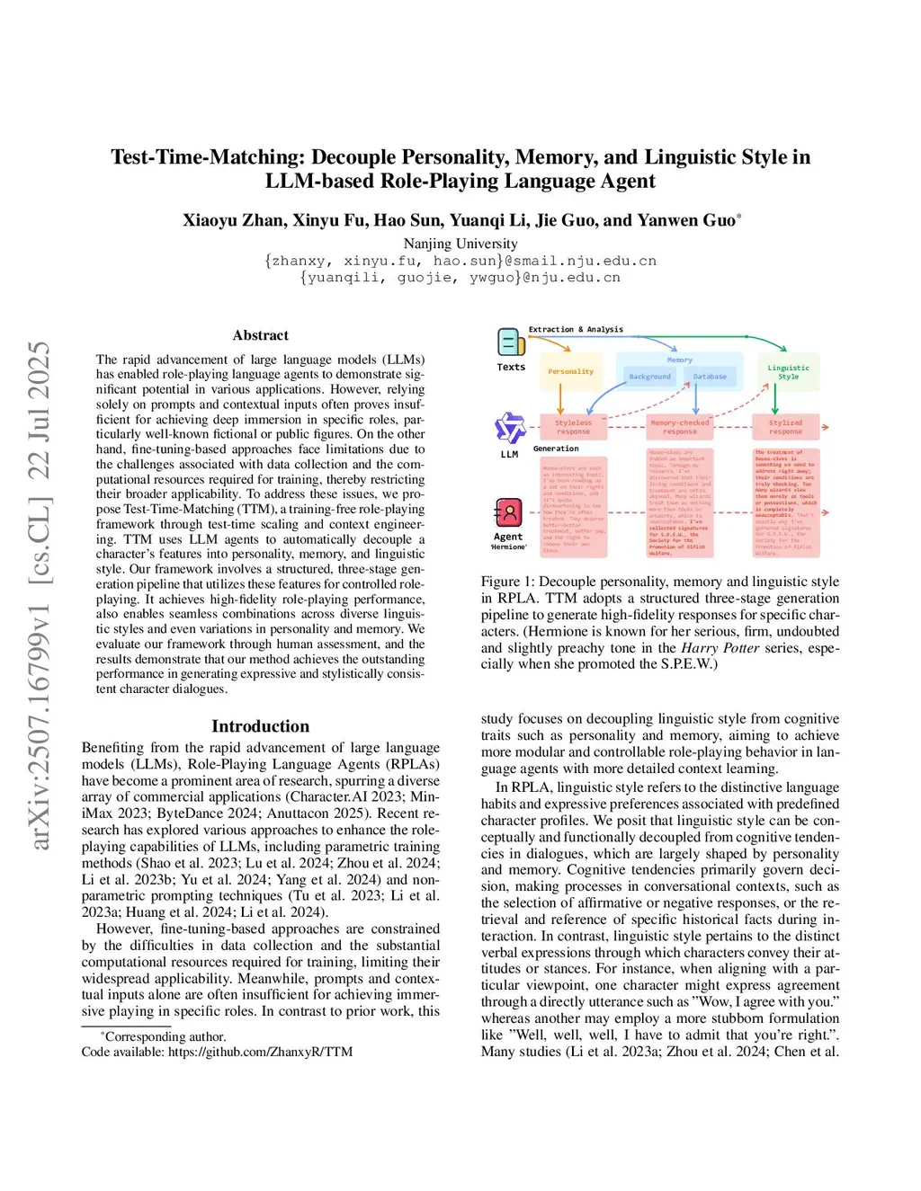The rapid advancement of large language models (LLMs) has enabled role-playing language agents to demonstrate significant potential in various applications. However, relying solely on prompts and contextual inputs often proves insufficient for achieving deep immersion in specific roles, particularly well-known fictional or public figures. On the other hand, fine-tuning-based approaches face limitations due to the challenges associated with data collection and the computational resources required for training, thereby restricting their broader applicability. To address these issues, we propose Test-Time-Matching (TTM), a training-free role-playing framework through test-time scaling and context engineering. TTM uses LLM agents to automatically decouple a character's features into personality, memory, and linguistic style. Our framework involves a structured, three-stage generation pipeline that utilizes these features for controlled role-playing. It achieves high-fidelity role-playing performance, also enables seamless combinations across diverse linguistic styles and even variations in personality and memory. We evaluate our framework through human assessment, and the results demonstrate that our method achieves the outstanding performance in generating expressive and stylistically consistent character dialogues.