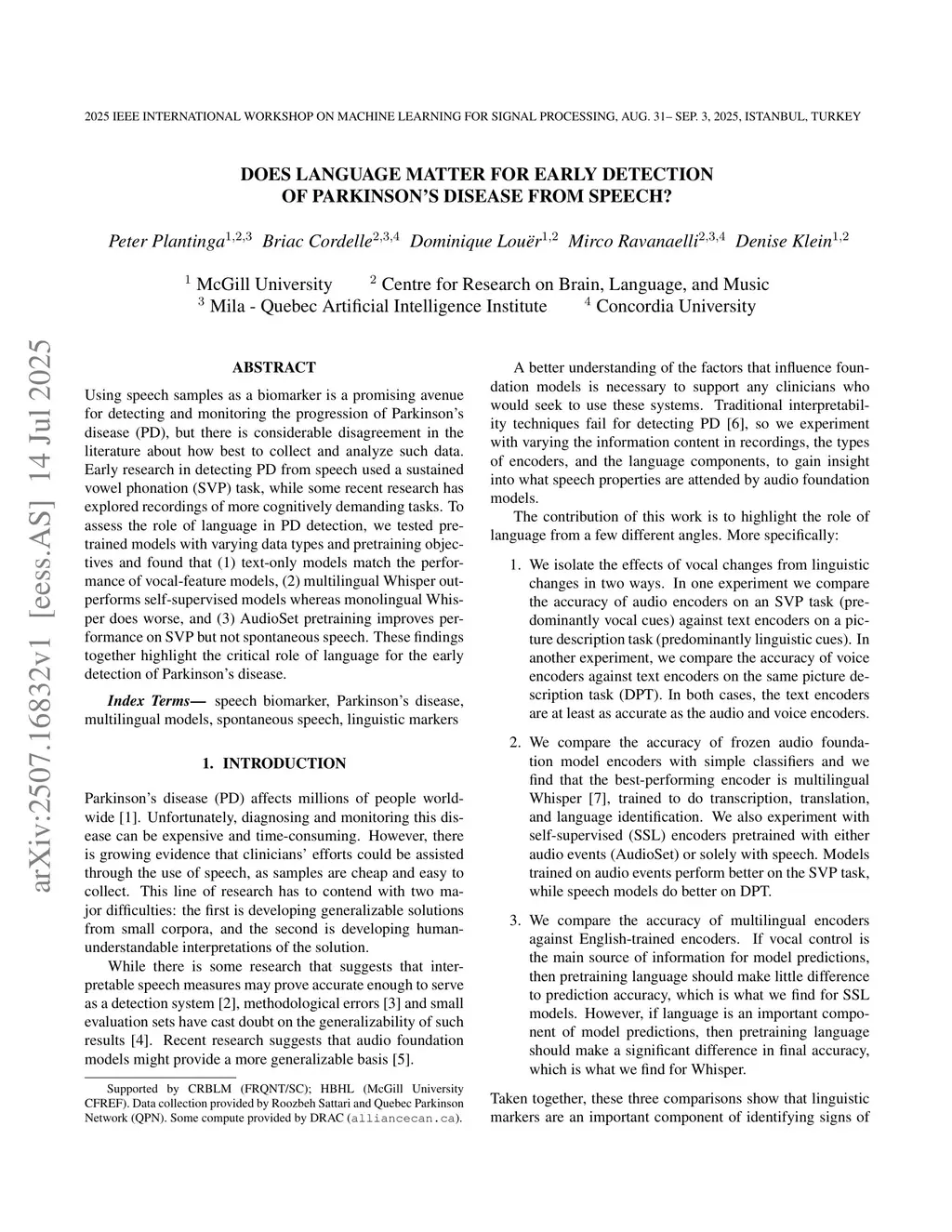 Using speech samples as a biomarker is a promising avenue for detecting and monitoring the progression of Parkinson's disease (PD), but there is considerable disagreement in the literature about how best to collect and analyze such data. Early research in detecting PD from speech used a sustained vowel phonation (SVP) task, while some recent research has explored recordings of more cognitively demanding tasks. To assess the role of language in PD detection, we tested pretrained models with varying data types and pretraining objectives and found that (1) text-only models match the performance of vocal-feature models, (2) multilingual Whisper outperforms self-supervised models whereas monolingual Whisper does worse, and (3) AudioSet pretraining improves performance on SVP but not spontaneous speech. These findings together highlight the critical role of language for the early detection of Parkinson's disease.