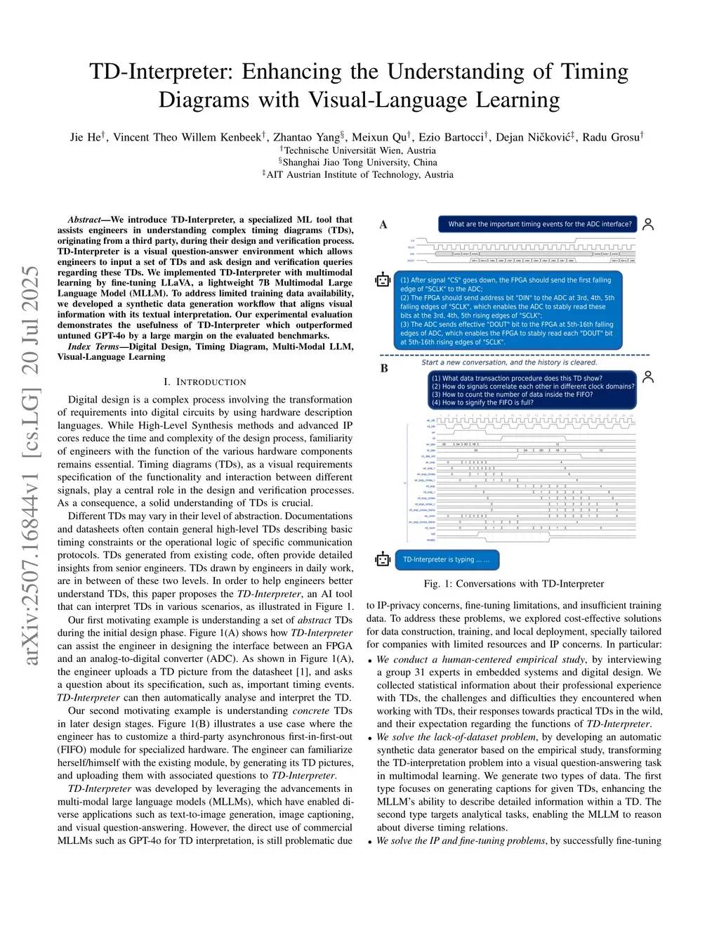 We introduce TD-Interpreter, a specialized ML tool that assists engineers in understanding complex timing diagrams (TDs), originating from a third party, during their design and verification process. TD-Interpreter is a visual question-answer environment which allows engineers to input a set of TDs and ask design and verification queries regarding these TDs. We implemented TD-Interpreter with multimodal learning by fine-tuning LLaVA, a lightweight 7B Multimodal Large Language Model (MLLM). To address limited training data availability, we developed a synthetic data generation workflow that aligns visual information with its textual interpretation. Our experimental evaluation demonstrates the usefulness of TD-Interpreter which outperformed untuned GPT-4o by a large margin on the evaluated benchmarks.