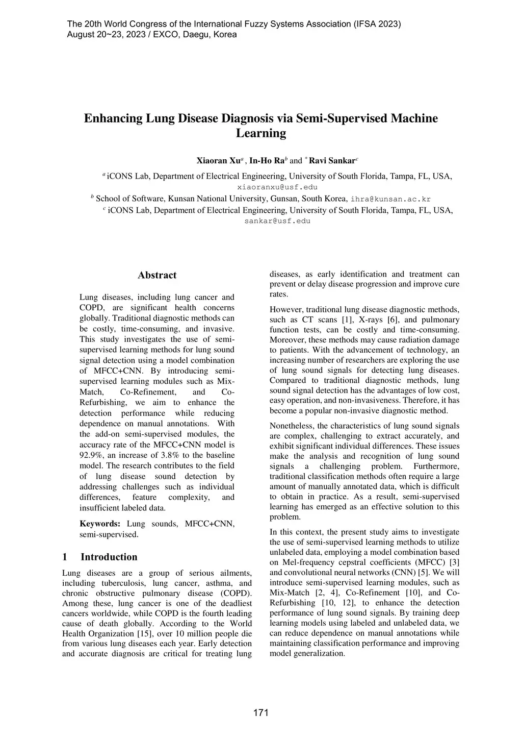 Lung diseases, including lung cancer and COPD, are significant health concerns globally. Traditional diagnostic methods can be costly, time-consuming, and invasive. This study investigates the use of semi supervised learning methods for lung sound signal detection using a model combination of MFCC+CNN. By introducing semi supervised learning modules such as Mix Match, Co-Refinement, and Co Refurbishing, we aim to enhance the detection performance while reducing dependence on manual annotations. With the add-on semi-supervised modules, the accuracy rate of the MFCC+CNN model is 92.9%, an increase of 3.8% to the baseline model. The research contributes to the field of lung disease sound detection by addressing challenges such as individual differences, feature insufficient labeled data.