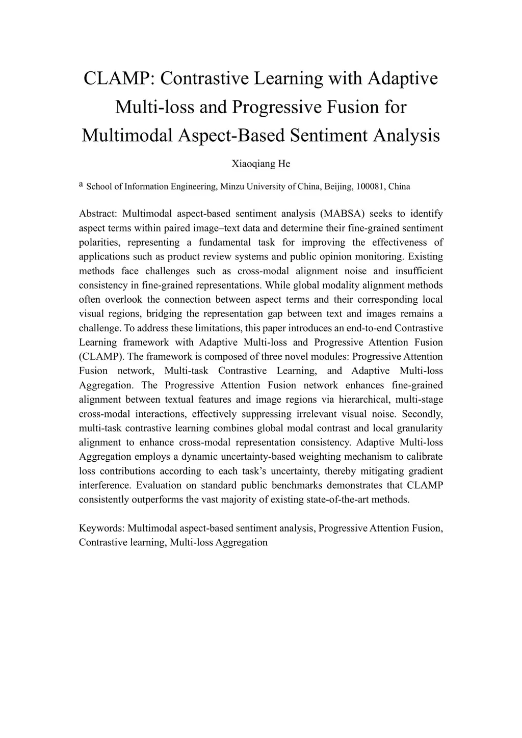 Multimodal aspect-based sentiment analysis(MABSA) seeks to identify aspect terms within paired image-text data and determine their fine grained sentiment polarities, representing a fundamental task for improving the effectiveness of applications such as product review systems and public opinion monitoring. Existing methods face challenges such as cross modal alignment noise and insufficient consistency in fine-grained representations. While global modality alignment methods often overlook the connection between aspect terms and their corresponding local visual regions, bridging the representation gap between text and images remains a challenge. To address these limitations, this paper introduces an end to end Contrastive Learning framework with Adaptive Multi-loss and Progressive Attention Fusion(CLAMP). The framework is composed of three novel modules: Progressive Attention Fusion network, Multi-task Contrastive Learning, and Adaptive Multi-loss Aggregation. The Progressive Attention Fusion network enhances fine-grained alignment between textual features and image regions via hierarchical, multi-stage cross modal interactions, effectively suppressing irrelevant visual noise. Secondly, multi-task contrastive learning combines global modal contrast and local granularity alignment to enhance cross modal representation consistency. Adaptive Multi-loss Aggregation employs a dynamic uncertainty based weighting mechanism to calibrate loss contributions according to each task's uncertainty, thereby mitigating gradient interference. Evaluation on standard public benchmarks demonstrates that CLAMP consistently outperforms the vast majority of existing state of the art methods.